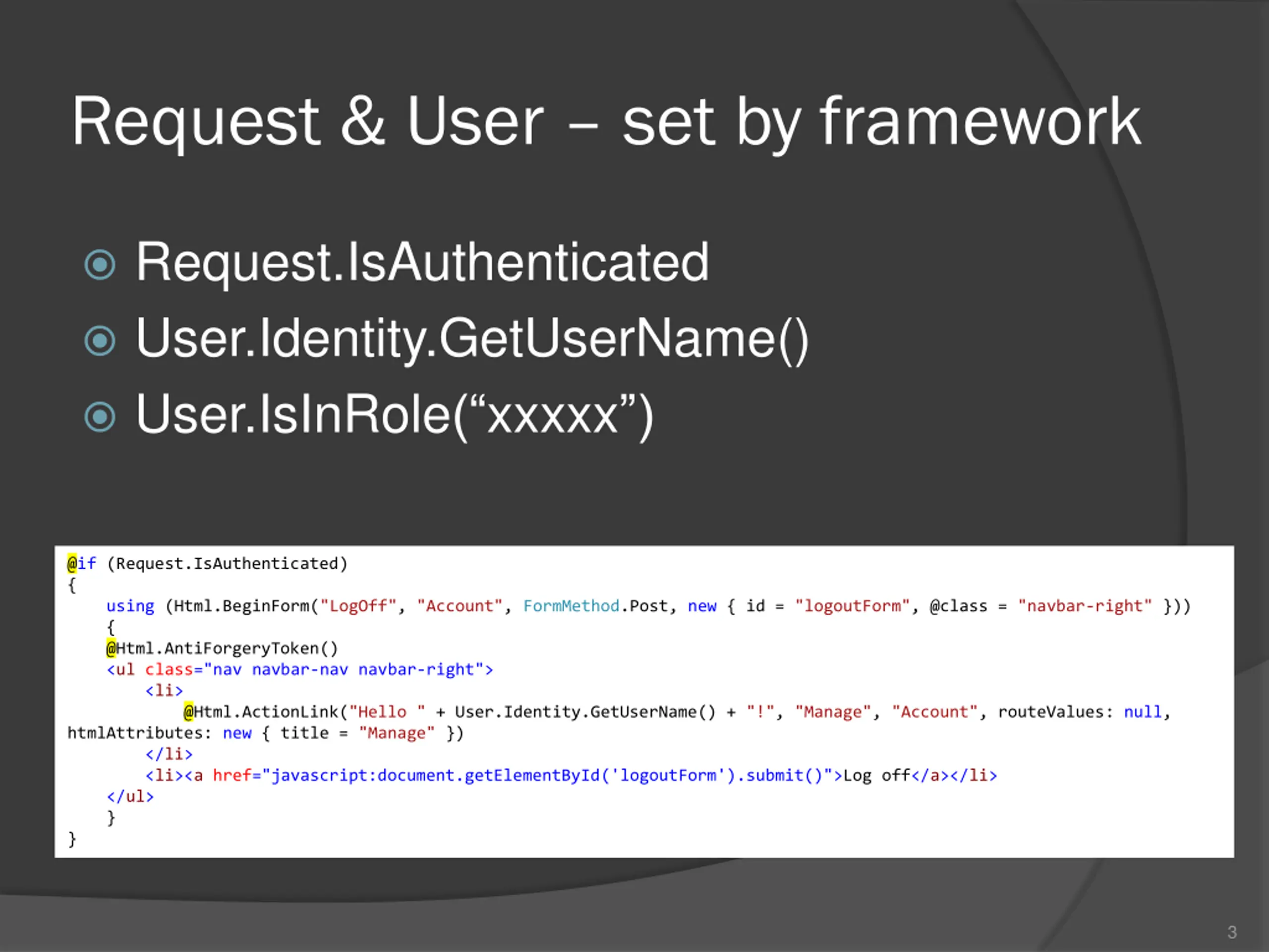 Request & User set by framework Request.IsAuthenticated User.Identity.GetUserName() User.IsInRole( xxxxx ) @if (Request.IsAuthenticated) { using (Html.BeginForm("LogOff", "Account", FormMethod.Post, new { id = "logoutForm", @class = "navbar-right" })) { @Html.AntiForgeryToken() <ul class="nav navbar-nav navbar-right"> <li> @Html.ActionLink("Hello " + User.Identity.GetUserName() + "!", "Manage", "Account", routeValues: null, htmlAttributes: new { title = "Manage" }) </li> <li><a href="javascript:document.getElementById('logoutForm').submit()">Log off</a></li> </ul> } } 3