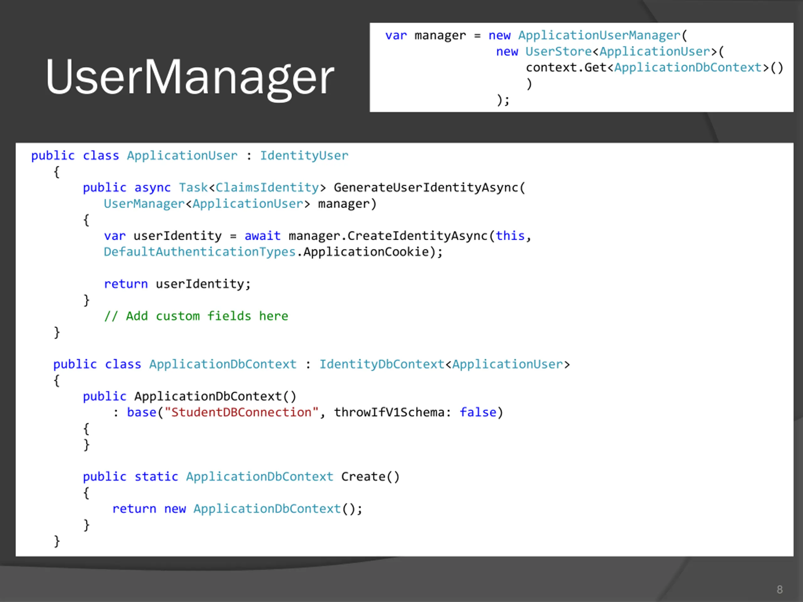 var manager = new ApplicationUserManager( new UserStore<ApplicationUser>( context.Get<ApplicationDbContext>() ) ); UserManager public class ApplicationUser : IdentityUser { public async Task<ClaimsIdentity> GenerateUserIdentityAsync( UserManager<ApplicationUser> manager) { var userIdentity = await manager.CreateIdentityAsync(this, DefaultAuthenticationTypes.ApplicationCookie); return userIdentity; } // Add custom fields here } public class ApplicationDbContext : IdentityDbContext<ApplicationUser> { public ApplicationDbContext() : base("StudentDBConnection", throwIfV1Schema: false) { } public static ApplicationDbContext Create() { return new ApplicationDbContext(); } } 8