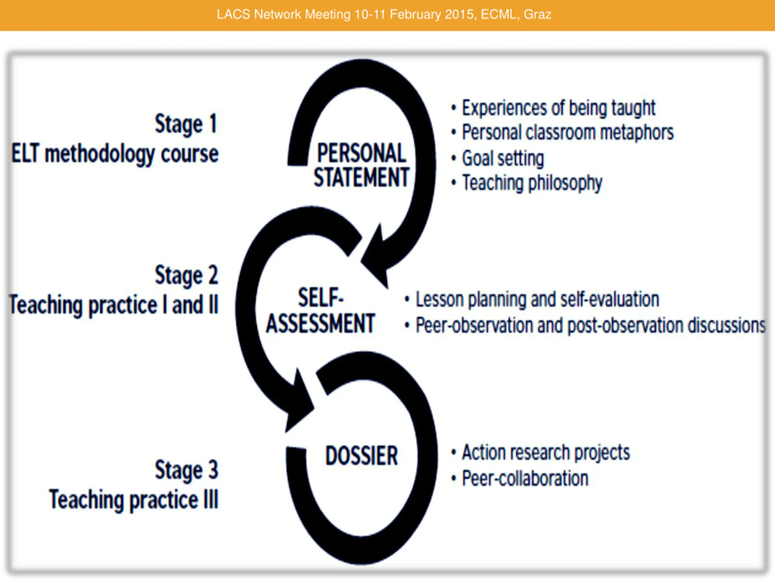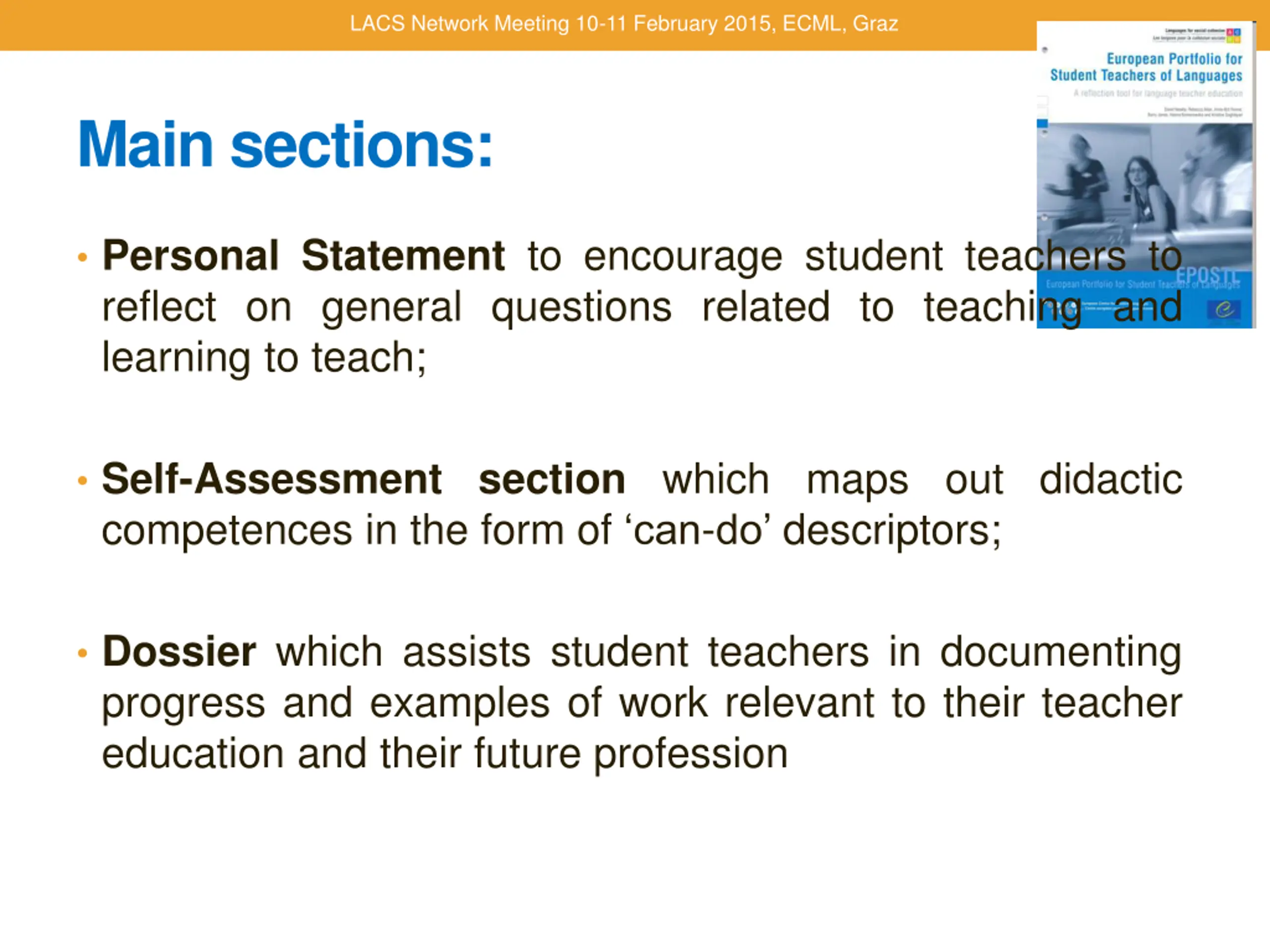 LACS Network Meeting 10-11 February 2015, ECML, Graz Main sections: Personal Statement to encourage student teachers to reflect on general questions related to teaching and learning to teach; Self-Assessment section which maps out didactic competences in the form of can-do descriptors; Dossier which assists student teachers in documenting progress and examples of work relevant to their teacher education and their future profession