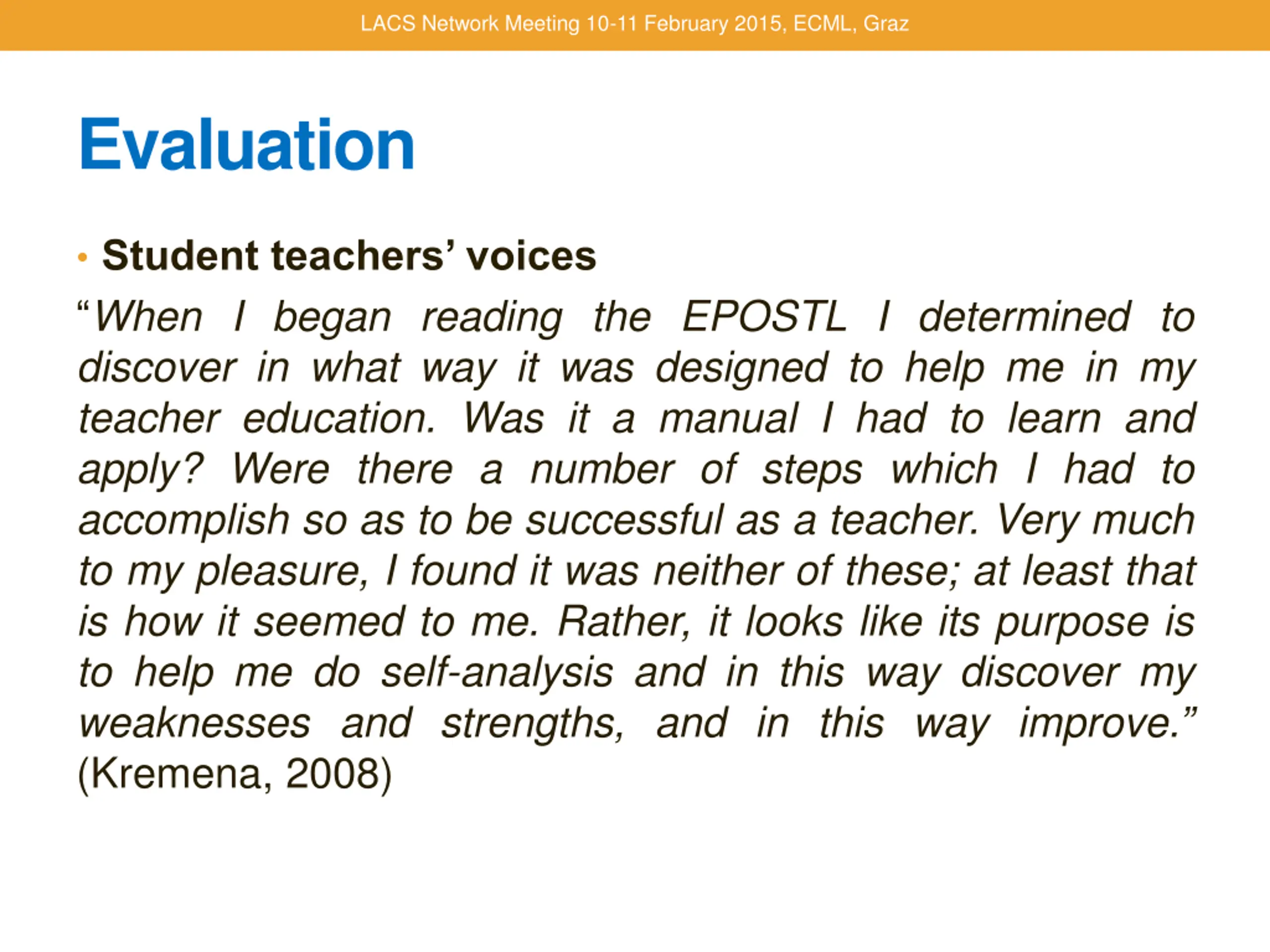 LACS Network Meeting 10-11 February 2015, ECML, Graz Evaluation Student teachers voices When I began reading the EPOSTL I determined to discover in what way it was designed to help me in my teacher education. Was it a manual I had to learn and apply? Were there a number of steps which I had to accomplish so as to be successful as a teacher. Very much to my pleasure, I found it was neither of these; at least that is how it seemed to me. Rather, it looks like its purpose is to help me do self-analysis and in this way discover my weaknesses and strengths, and in this way improve. (Kremena, 2008)