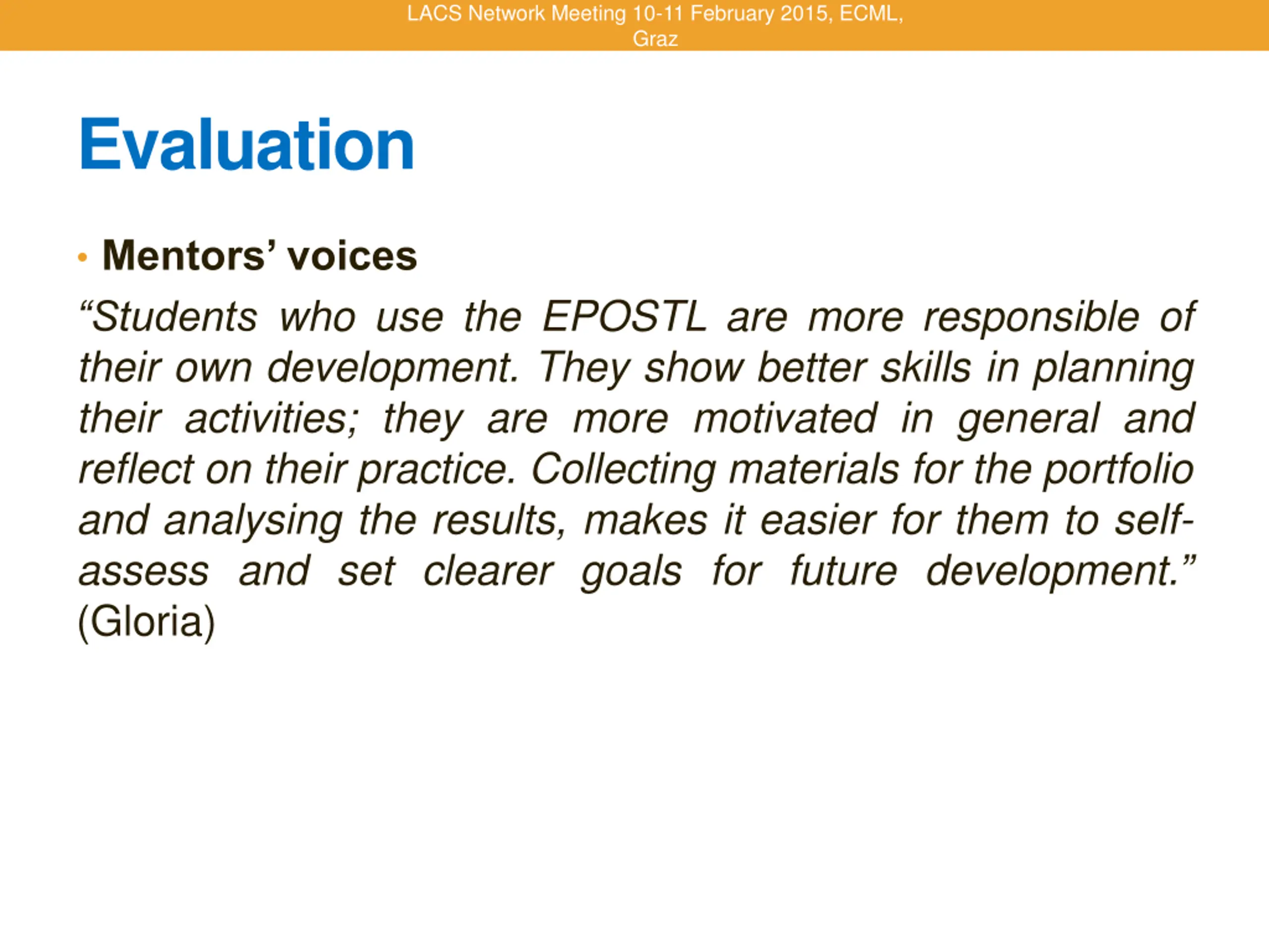 LACS Network Meeting 10-11 February 2015, ECML, Graz Evaluation Mentors voices Students who use the EPOSTL are more responsible of their own development. They show better skills in planning their activities; they are more motivated in general and reflect on their practice. Collecting materials for the portfolio and analysing the results, makes it easier for them to self- assess and set clearer goals for future development. (Gloria)