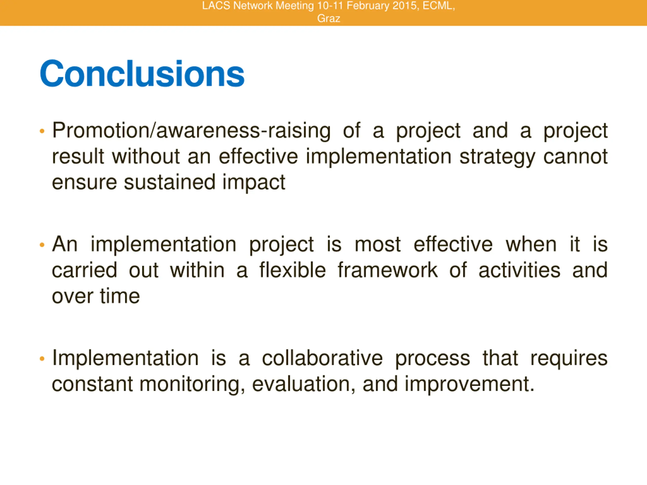 LACS Network Meeting 10-11 February 2015, ECML, Graz Conclusions Promotion/awareness-raising of a project and a project result without an effective implementation strategy cannot ensure sustained impact An implementation project is most effective when it is carried out within a flexible framework of activities and over time Implementation is a collaborative process that requires constant monitoring, evaluation, and improvement.