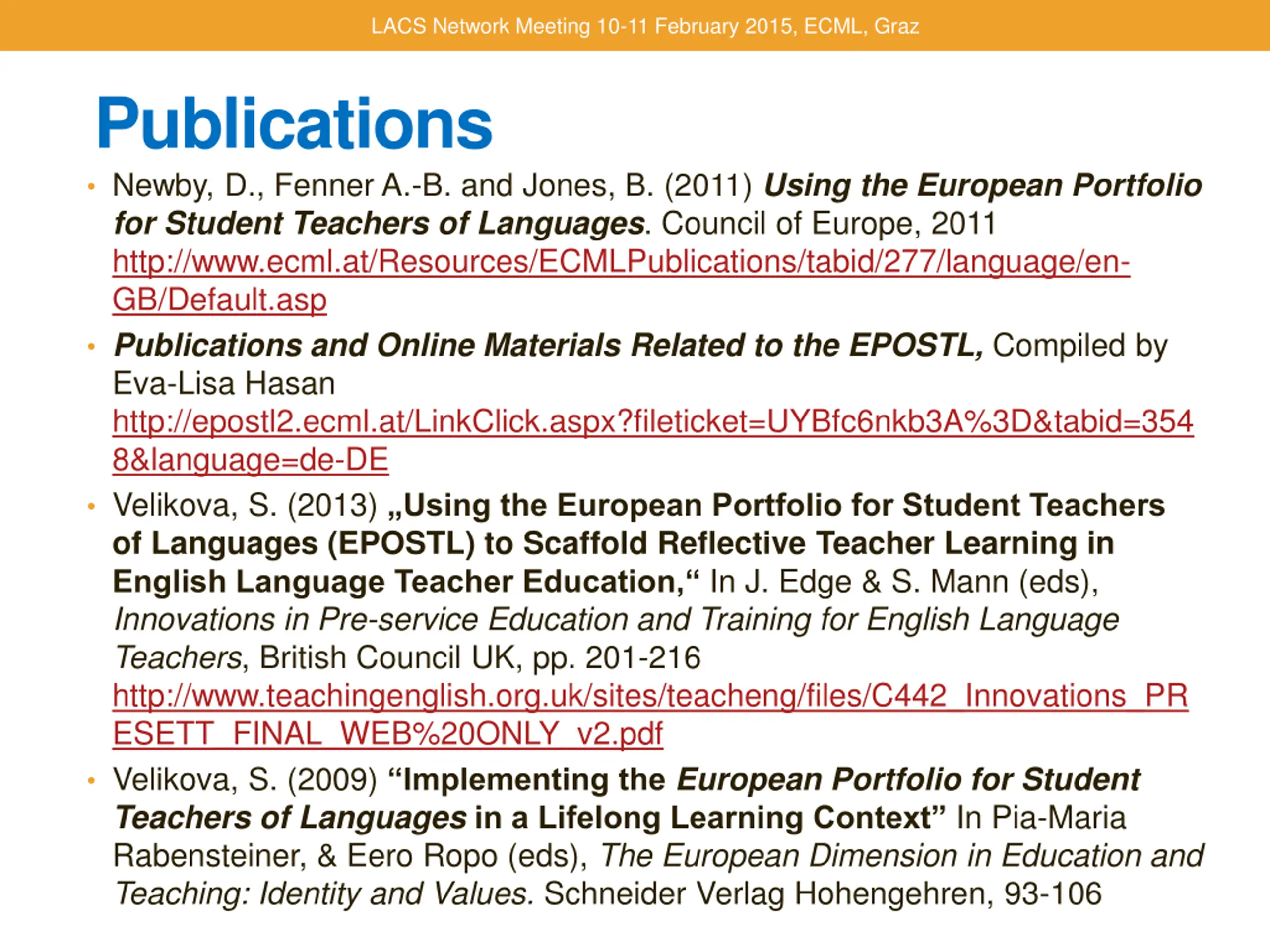 LACS Network Meeting 10-11 February 2015, ECML, Graz Publications Newby, D., Fenner A.-B. and Jones, B. (2011) Using the European Portfolio for Student Teachers of Languages. Council of Europe, 2011 http://www.ecml.at/Resources/ECMLPublications/tabid/277/language/en- GB/Default.asp Publications and Online Materials Related to the EPOSTL, Compiled by Eva-Lisa Hasan http://epostl2.ecml.at/LinkClick.aspx?fileticket=UYBfc6nkb3A%3D&tabid=354 8&language=de-DE Velikova, S. (2013) Using the European Portfolio for Student Teachers of Languages (EPOSTL) to Scaffold Reflective Teacher Learning in English Language Teacher Education, In J. Edge & S. Mann (eds), Innovations in Pre-service Education and Training for English Language Teachers, British Council UK, pp. 201-216 http://www.teachingenglish.org.uk/sites/teacheng/files/C442_Innovations_PR ESETT_FINAL_WEB%20ONLY_v2.pdf Velikova, S. (2009) Implementing the European Portfolio for Student Teachers of Languagesin a Lifelong Learning Context In Pia-Maria Rabensteiner, & Eero Ropo (eds), The European Dimension in Education and Teaching: Identity and Values. Schneider Verlag Hohengehren, 93-106