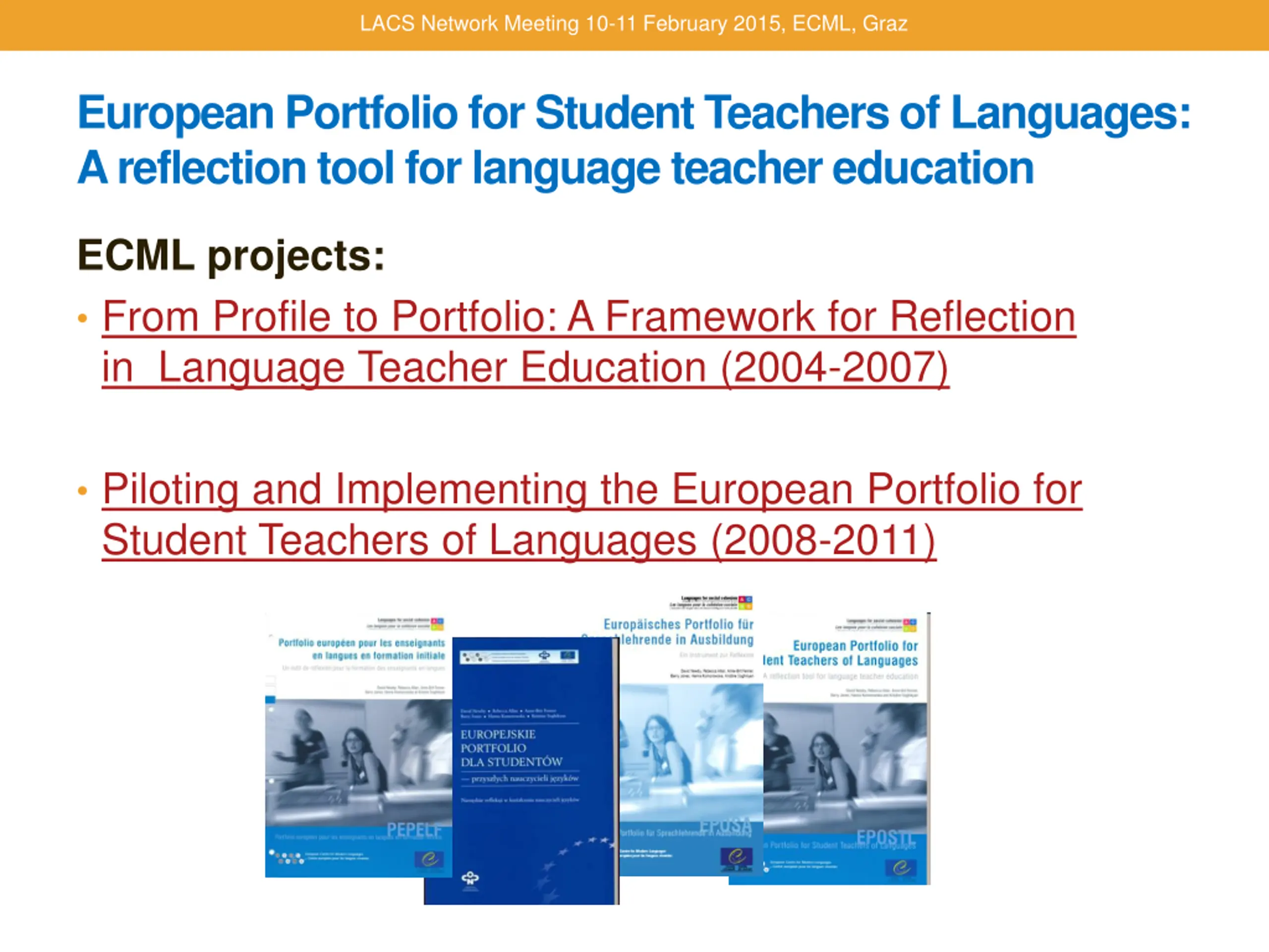 LACS Network Meeting 10-11 February 2015, ECML, Graz European Portfolio for Student Teachers of Languages: A reflection tool for language teacher education ECML projects: From Profile to Portfolio: A Framework for Reflection in Language Teacher Education (2004-2007) Piloting and Implementing the European Portfolio for Student Teachers of Languages (2008-2011)