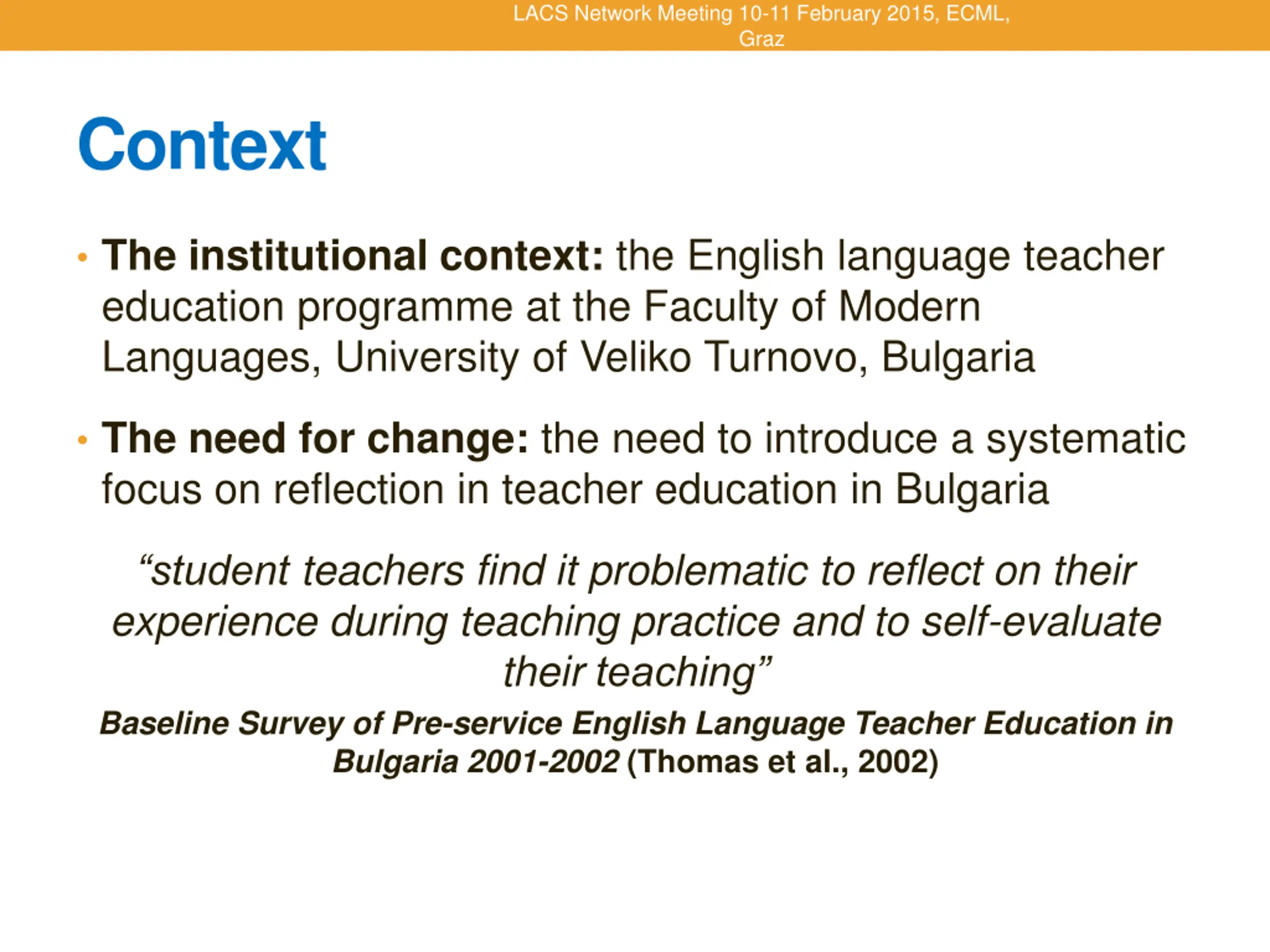 LACS Network Meeting 10-11 February 2015, ECML, Graz Context The institutional context: the English language teacher education programme at the Faculty of Modern Languages, University of Veliko Turnovo, Bulgaria The need for change: the need to introduce a systematic focus on reflection in teacher education in Bulgaria student teachers find it problematic to reflect on their experience during teaching practice and to self-evaluate their teaching Baseline Survey of Pre-service English Language Teacher Education in Bulgaria 2001-2002 (Thomas et al., 2002)
