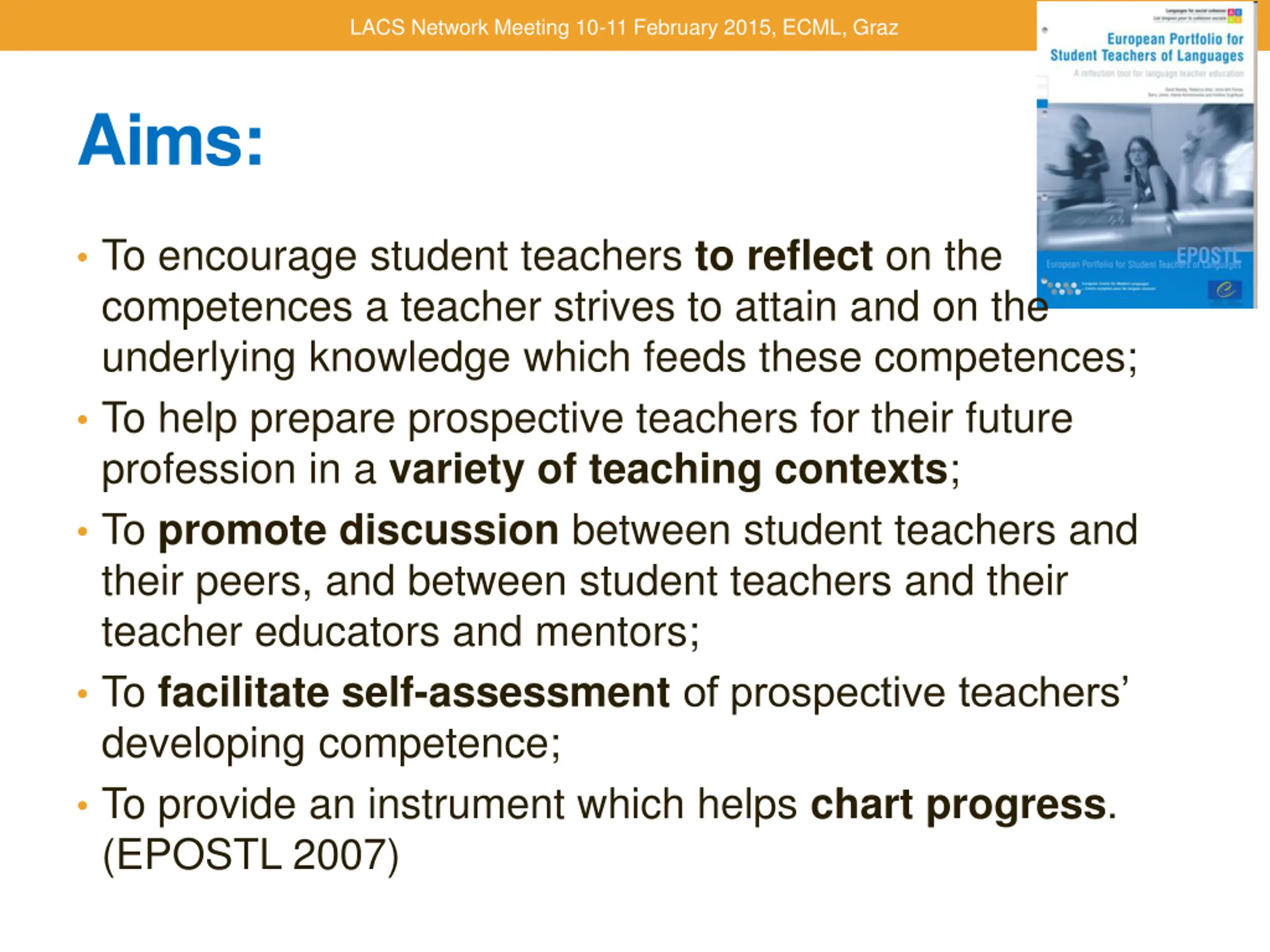 LACS Network Meeting 10-11 February 2015, ECML, Graz Aims: To encourage student teachers to reflect on the competences a teacher strives to attain and on the underlying knowledge which feeds these competences; To help prepare prospective teachers for their future profession in a variety of teaching contexts; To promote discussion between student teachers and their peers, and between student teachers and their teacher educators and mentors; To facilitate self-assessmentof prospective teachers developing competence; To provide an instrument which helps chart progress. (EPOSTL 2007)