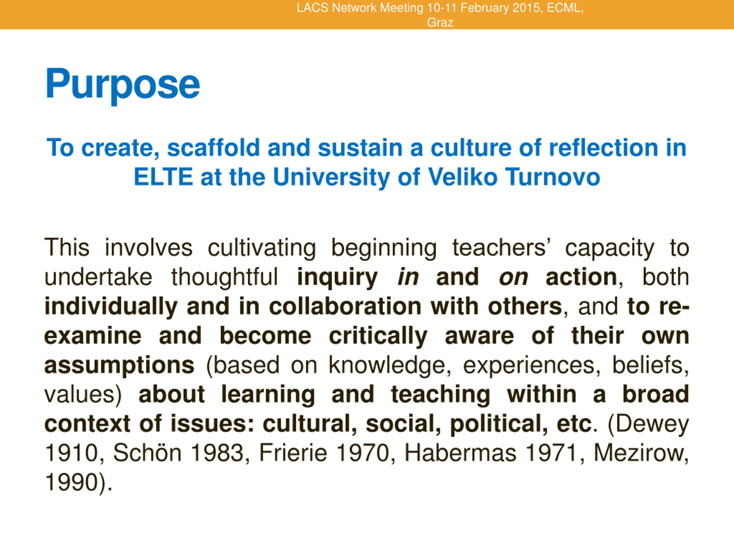 LACS Network Meeting 10-11 February 2015, ECML, Graz Purpose To create, scaffold and sustain a culture of reflection in ELTE at the University of Veliko Turnovo This involves cultivating beginning teachers capacity to undertake thoughtful inquiry in and on action, both individually and in collaboration with others, and to re- examine and become critically aware of their own assumptions (based on knowledge, experiences, beliefs, values) about learning and teaching within a broad context of issues: cultural, social, political, etc. (Dewey 1910, Sch n 1983, Frierie 1970, Habermas 1971, Mezirow, 1990).