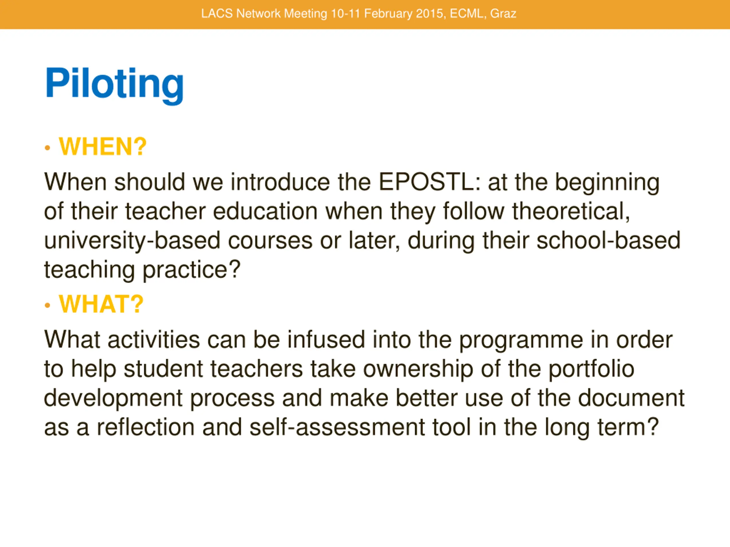 LACS Network Meeting 10-11 February 2015, ECML, Graz Piloting WHEN? When should we introduce the EPOSTL: at the beginning of their teacher education when they follow theoretical, university-based courses or later, during their school-based teaching practice? WHAT? What activities can be infused into the programme in order to help student teachers take ownership of the portfolio development process and make better use of the document as a reflection and self-assessment tool in the long term?