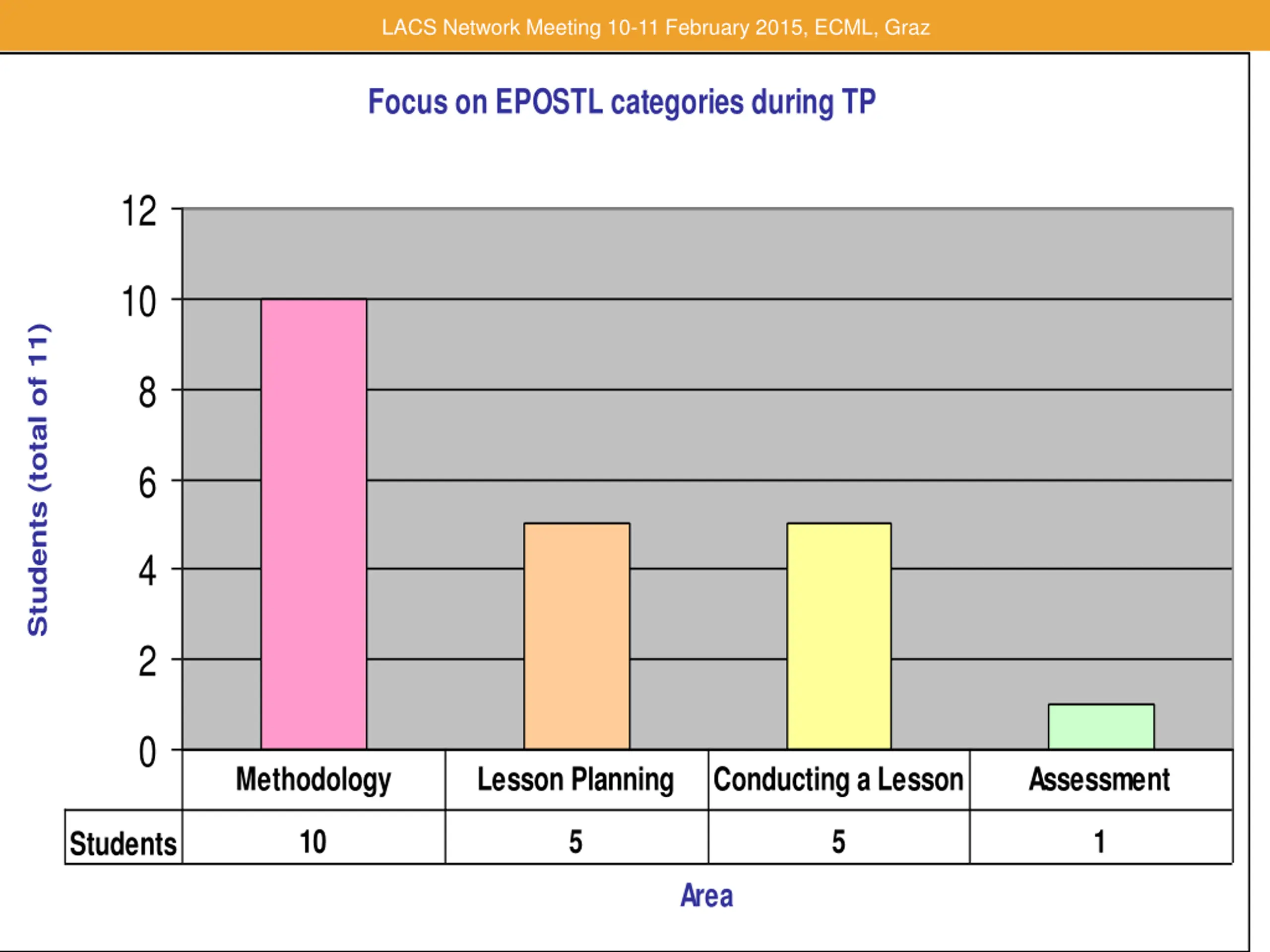 LACS Network Meeting 10-11 February 2015, ECML, Graz Focus on EPOSTL categories during TP 12 10 Students (total of 11) 8 6 4 2 0 Methodology Lesson Planning Conducting a Lesson Assessment 10 5 5 1 Students Area