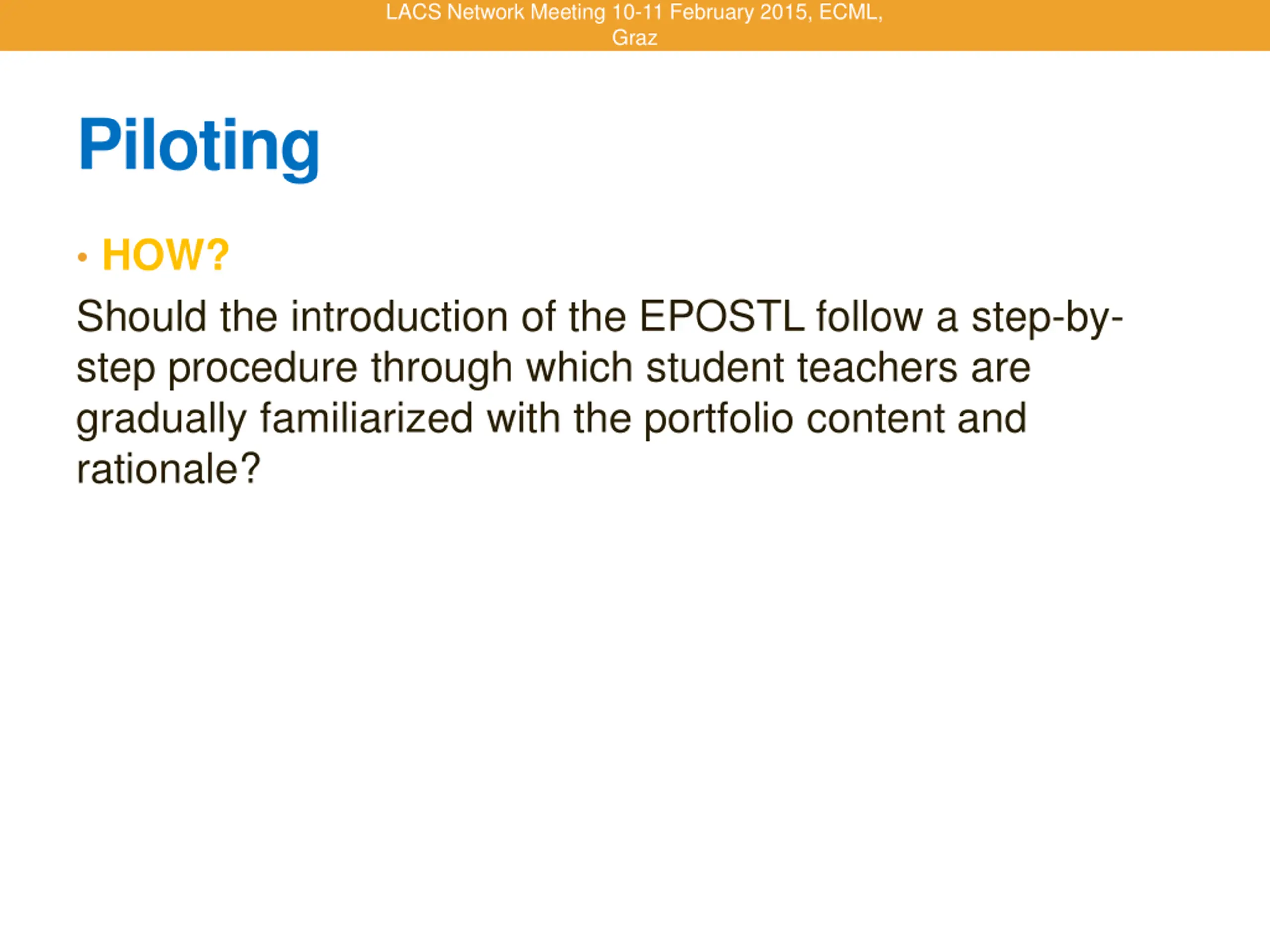 LACS Network Meeting 10-11 February 2015, ECML, Graz Piloting HOW? Should the introduction of the EPOSTL follow a step-by- step procedure through which student teachers are gradually familiarized with the portfolio content and rationale?