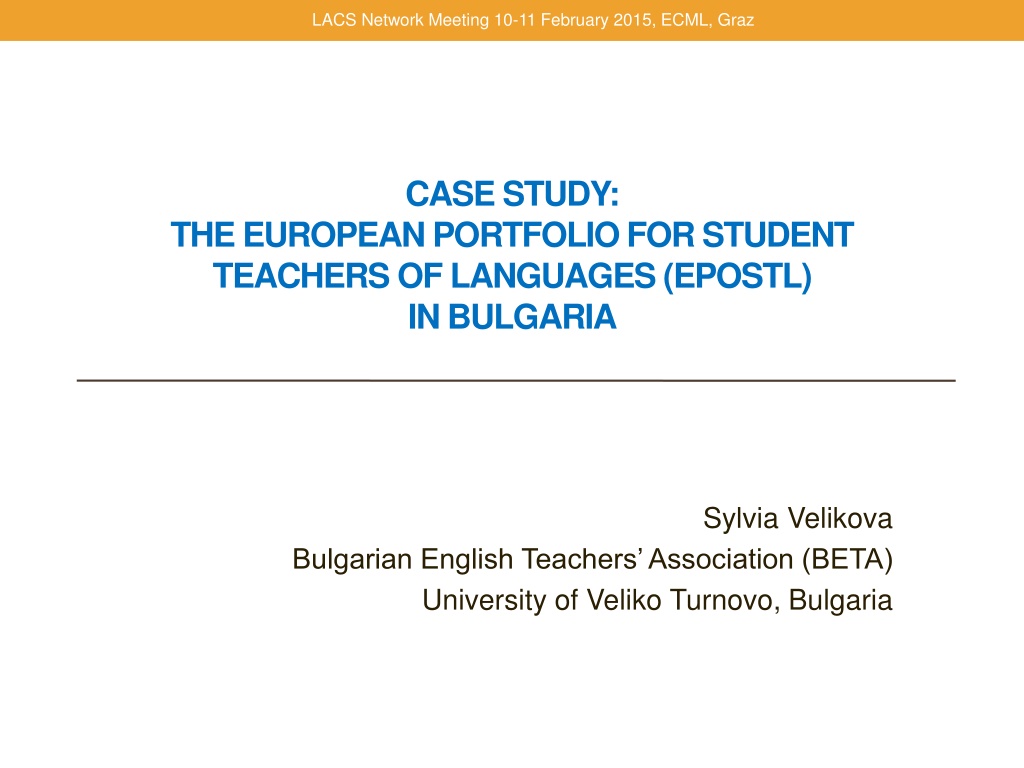 LACS Network Meeting 10-11 February 2015, ECML, Graz CASE STUDY: THE EUROPEAN PORTFOLIO FOR STUDENT TEACHERS OF LANGUAGES (EPOSTL) IN BULGARIA Sylvia Velikova Bulgarian English Teachers Association (BETA) University of Veliko Turnovo, Bulgaria