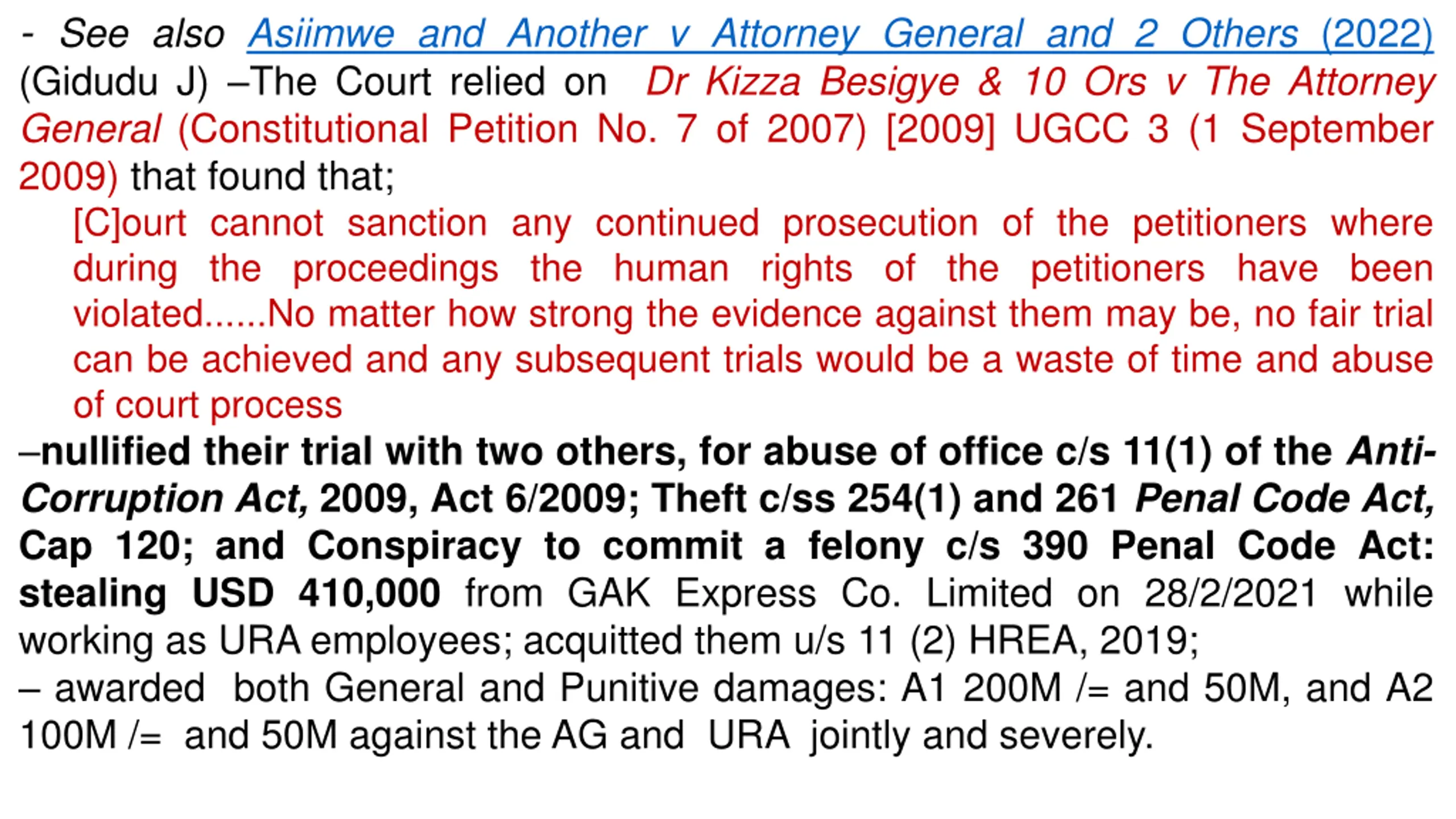 - See also Asiimwe and Another v Attorney General and 2 Others (2022) (Gidudu J) The Court relied on Dr Kizza Besigye & 10 Ors v The Attorney General (Constitutional Petition No. 7 of 2007) [2009] UGCC 3 (1 September 2009) that found that; [C]ourt cannot sanction any continued prosecution of the petitioners where during the proceedings the human rights of the petitioners have been violated......No matter how strong the evidence against them may be, no fair trial can be achieved and any subsequent trials would be a waste of time and abuse of court process nullified their trial with two others, for abuse of office c/s 11(1) of the Anti- Corruption Act, 2009, Act 6/2009; Theft c/ss 254(1) and 261 Penal Code Act, Cap 120; and Conspiracy to commit a felony c/s 390 Penal Code Act: stealing USD 410,000 from GAK Express Co. Limited on 28/2/2021 while working as URA employees; acquitted them u/s 11 (2) HREA, 2019; awarded both General and Punitive damages: A1 200M /= and 50M, and A2 100M /= and 50M against the AG and URA jointly and severely.