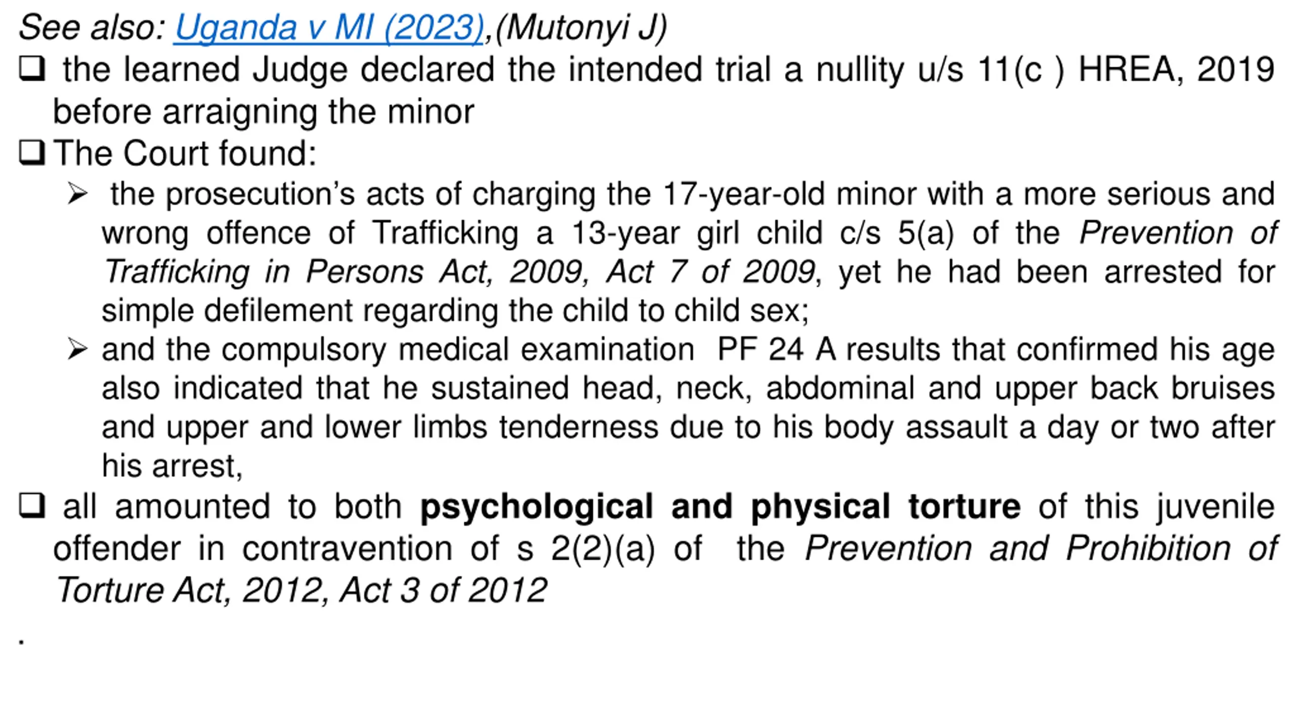 See also: Uganda v MI (2023),(Mutonyi J) the learned Judge declared the intended trial a nullity u/s 11(c ) HREA, 2019 before arraigning the minor The Court found: the prosecution s acts of charging the 17-year-old minor with a more serious and wrong offence of Trafficking a 13-year girl child c/s 5(a) of the Prevention of Trafficking in Persons Act, 2009, Act 7 of 2009, yet he had been arrested for simple defilement regarding the child to child sex; and the compulsory medical examination PF 24 A results that confirmed his age also indicated that he sustained head, neck, abdominal and upper back bruises and upper and lower limbs tenderness due to his body assault a day or two after his arrest, all amounted to both psychological and physical torture of this juvenile offender in contravention of s 2(2)(a) of Torture Act, 2012, Act 3 of 2012 . the Prevention and Prohibition of
