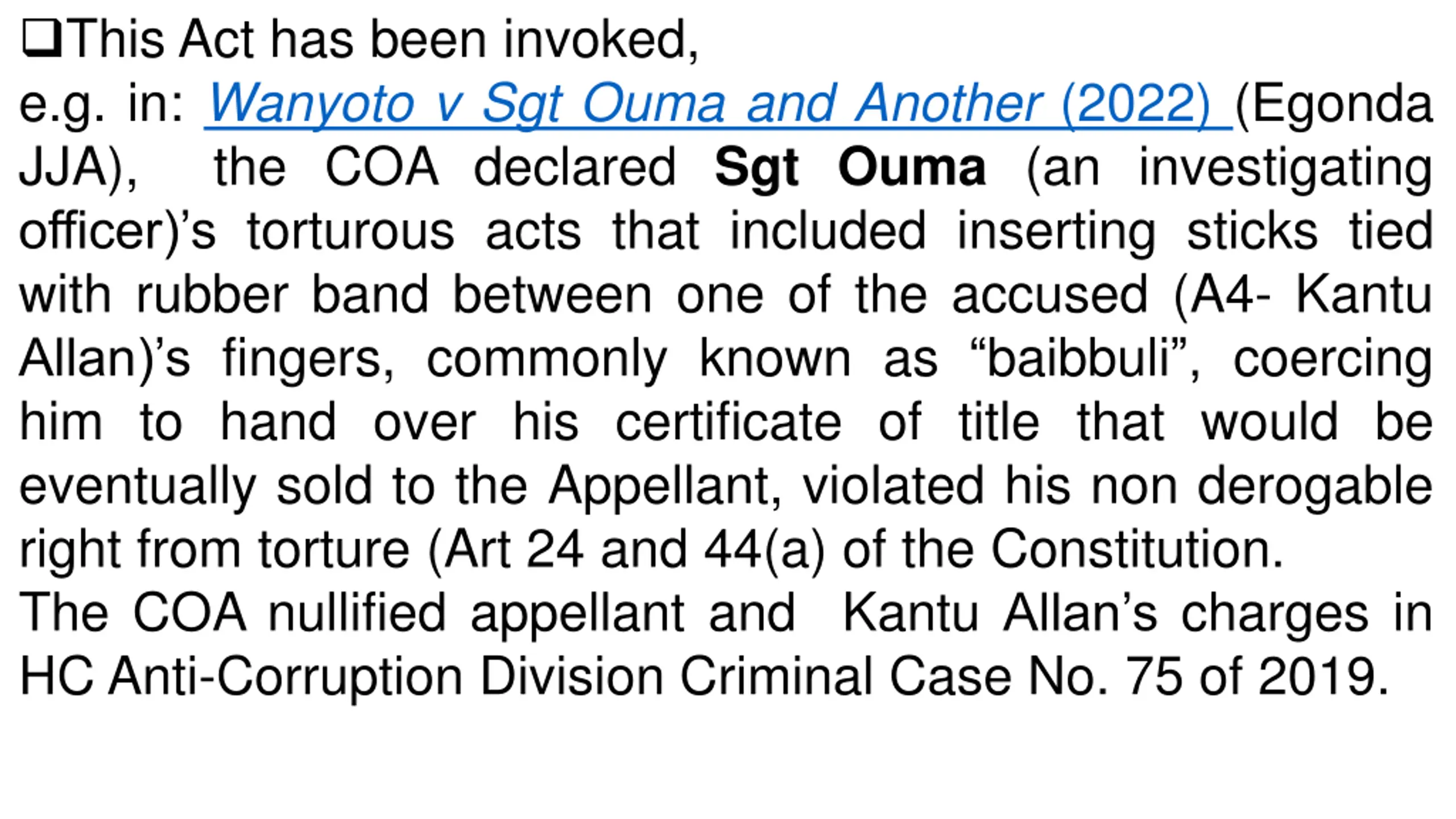 This Act has been invoked, e.g. in: Wanyoto v Sgt Ouma and Another (2022) (Egonda JJA), the COA declared Sgt Ouma (an investigating officer) s torturous acts that included inserting sticks tied with rubber band between one of the accused (A4- Kantu Allan) s fingers, commonly known as baibbuli , coercing him to hand over his certificate of title that would be eventually sold to the Appellant, violated his non derogable right from torture (Art 24 and 44(a) of the Constitution. The COA nullified appellant and Kantu Allan s charges in HC Anti-Corruption Division Criminal Case No. 75 of 2019.