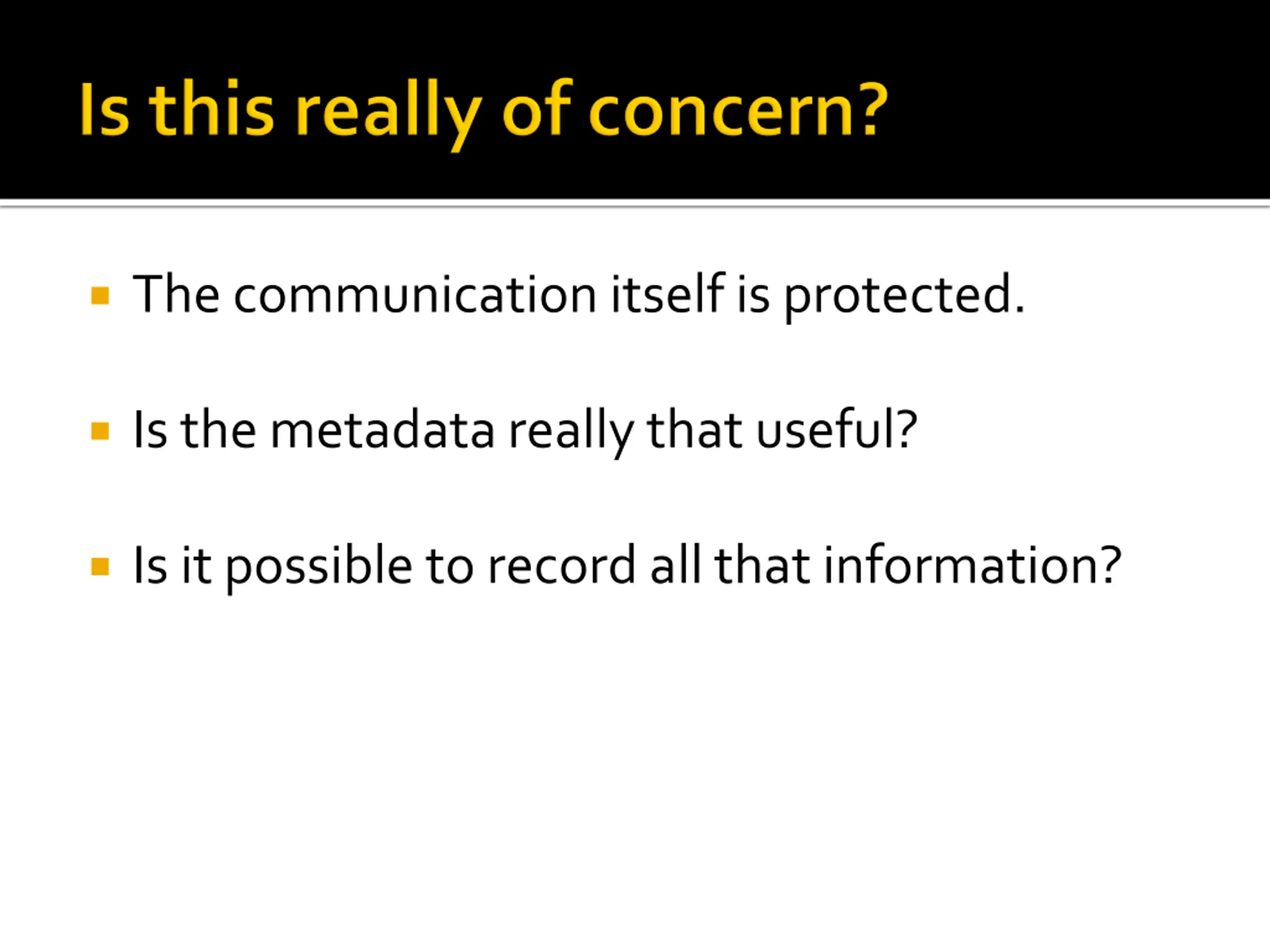 The communication itself is protected. Is the metadata really that useful? Is it possible to record all that information?