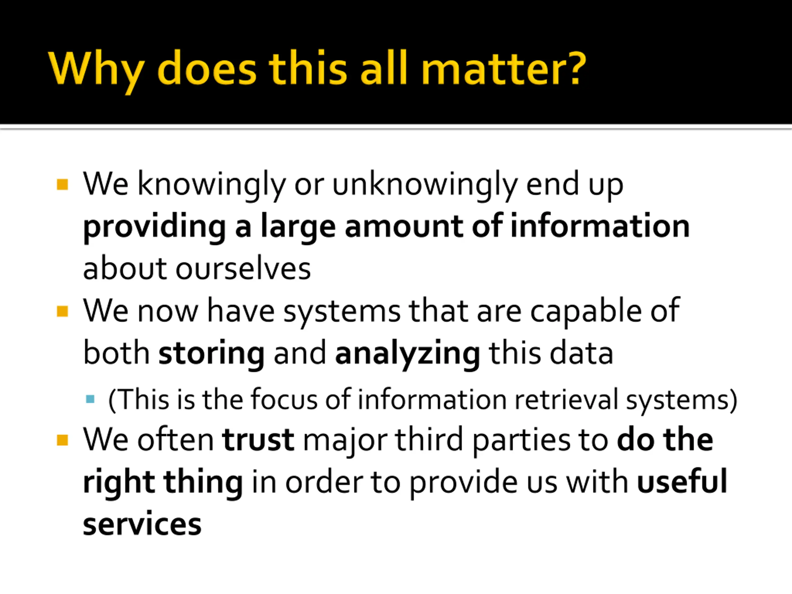 We knowingly or unknowingly end up providing a large amount of information about ourselves We now have systems that are capable of both storing and analyzing this data (This is the focus of information retrieval systems) We often trust major third parties to do the right thing in order to provide us with useful services