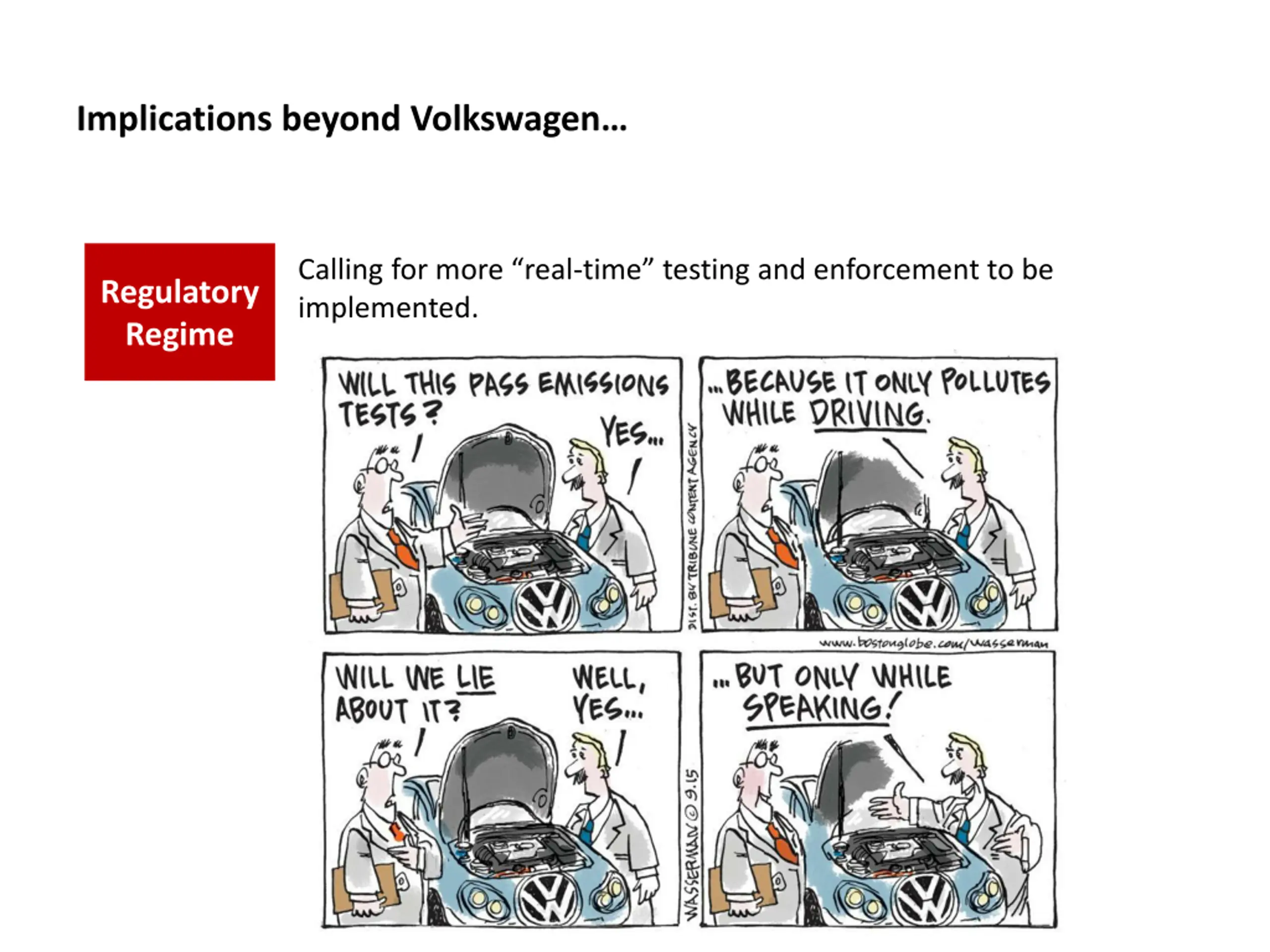 Implications beyond Volkswagen Calling for more real-time testing and enforcement to be implemented. Regulatory Regime