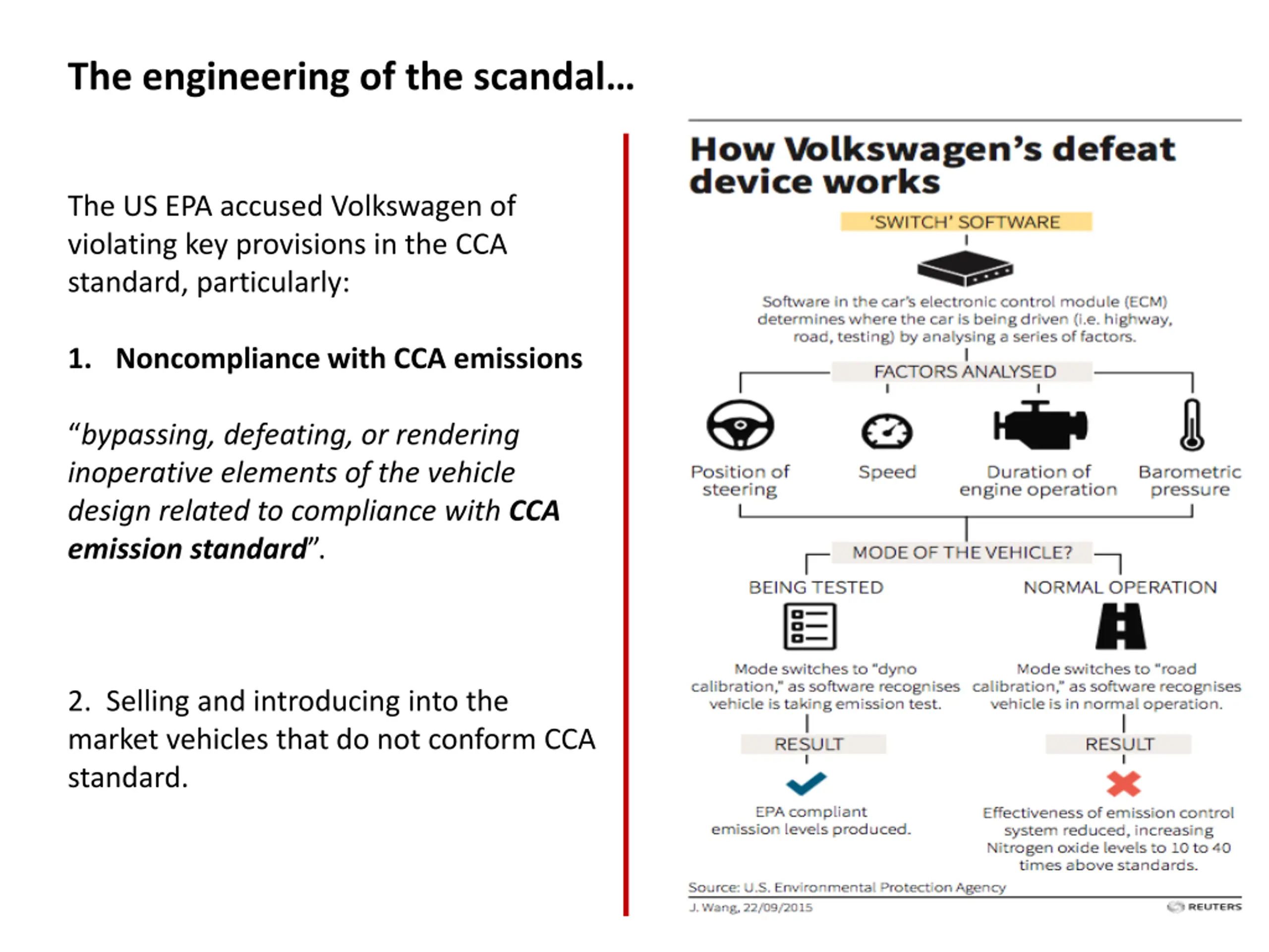 The engineering of the scandal The US EPA accused Volkswagen of violating key provisions in the CCA standard, particularly: 1. Noncompliance with CCA emissions bypassing, defeating, or rendering inoperative elements of the vehicle design related to compliance with CCA emission standard . 2. Selling and introducing into the market vehicles that do not conform CCA standard.
