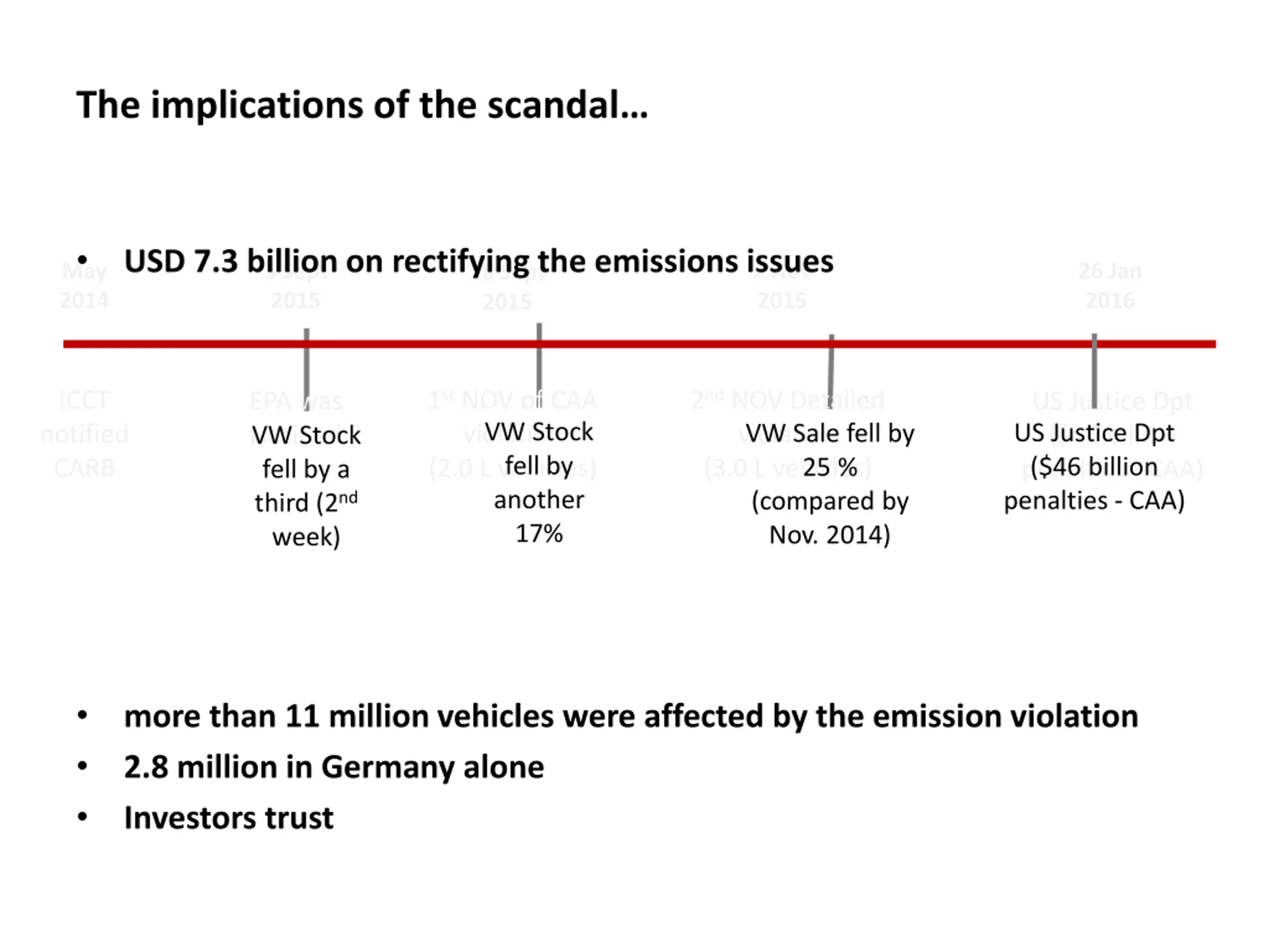 The implications of the scandal USD 7.3 billion on rectifying the emissions issues May 2014 3 Sept 2015 2 Nov 2015 26 Jan 2016 18 Sept 2015 1st NOV of CAA violation (2.0 L vehicles) fell by another 17% 2nd NOV Detailed violation (3.0 L vehicles) (compared by Nov. 2014) ICCT notified CARB EPA was Notified VW Stock fell by a third (2nd week) US Justice Dpt ($46 billion penalties - CAA) ($46 billion penalties - CAA) VW Stock US Justice Dpt VW Sale fell by 25 % more than 11 million vehicles were affected by the emission violation 2.8 million in Germany alone Investors trust