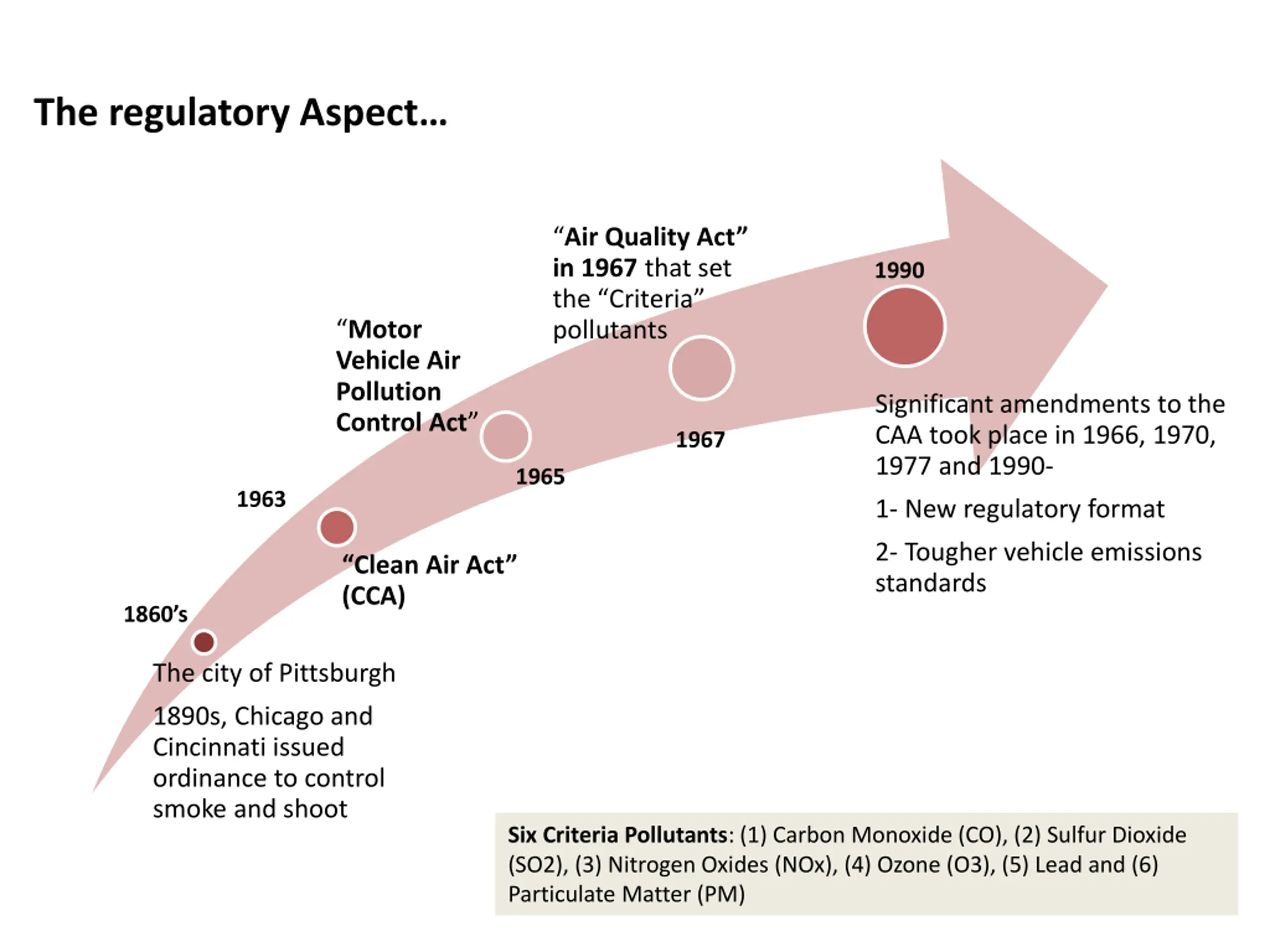 The regulatory Aspect Air Quality Act in 1967 that set the Criteria pollutants 1990 Motor Vehicle Air Pollution Control Act Significant amendments to the CAA took place in 1966, 1970, 1977 and 1990- 1967 1965 1963 1- New regulatory format 2- Tougher vehicle emissions standards Clean Air Act (CCA) 1860 s The city of Pittsburgh 1890s, Chicago and Cincinnati issued ordinance to control smoke and shoot Six Criteria Pollutants: (1) Carbon Monoxide (CO), (2) Sulfur Dioxide (SO2), (3) Nitrogen Oxides (NOx), (4) Ozone (O3), (5) Lead and (6) Particulate Matter (PM)