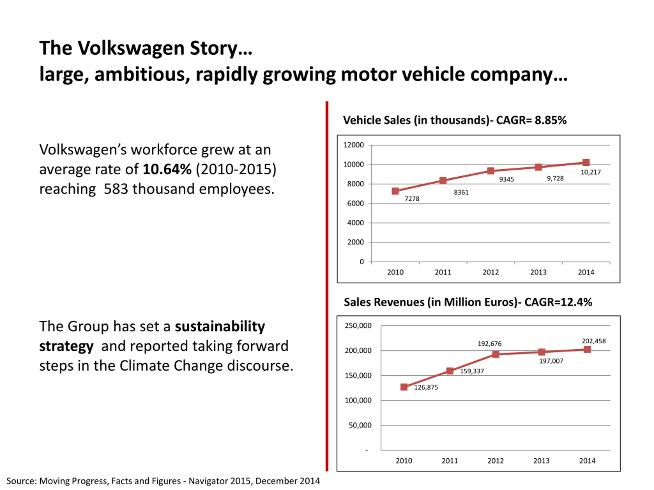 The Volkswagen Story large, ambitious, rapidly growing motor vehicle company Vehicle Sales (in thousands)- CAGR= 8.85% 12000 Volkswagen s workforce grew at an average rate of 10.64% (2010-2015) reaching 583 thousand employees. 10000 10,217 9,728 9345 8000 8361 7278 6000 4000 2000 0 2010 2011 2012 2013 2014 Sales Revenues (in Million Euros)- CAGR=12.4% The Group has set a sustainability strategy and reported taking forward steps in the Climate Change discourse. 250,000 202,458 192,676 200,000 197,007 159,337 150,000 126,875 100,000 50,000 - 2010 2011 2012 2013 2014 Source: Moving Progress, Facts and Figures - Navigator 2015, December 2014