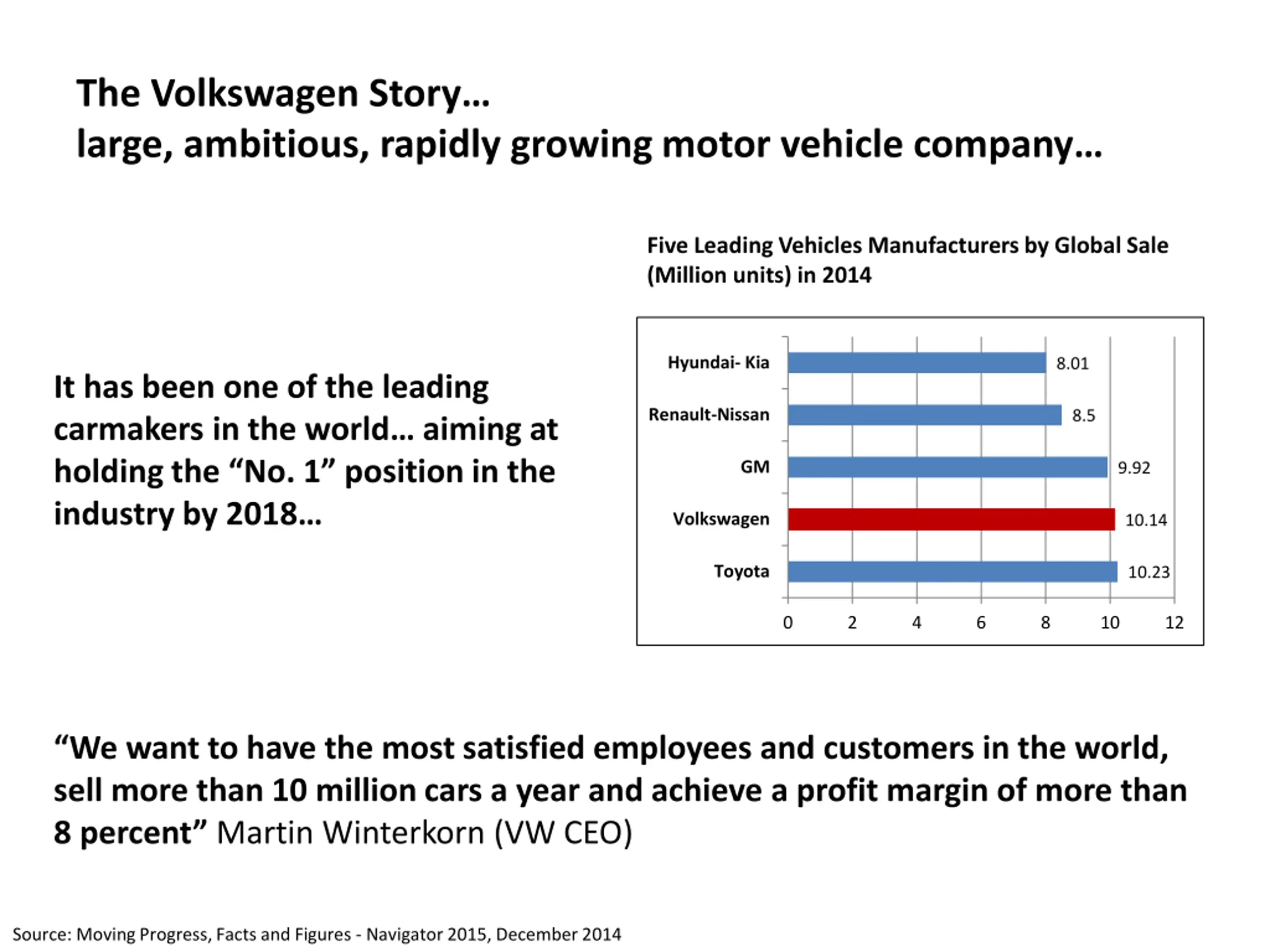 The Volkswagen Story large, ambitious, rapidly growing motor vehicle company Five Leading Vehicles Manufacturers by Global Sale (Million units) in 2014 Hyundai- Kia 8.01 It has been one of the leading carmakers in the world aiming at holding the No. 1 position in the industry by 2018 Renault-Nissan 8.5 GM 9.92 Volkswagen 10.14 Toyota 10.23 0 2 4 6 8 10 12 We want to have the most satisfied employees and customers in the world, sell more than 10 million cars a year and achieve a profit margin of more than 8 percent Martin Winterkorn (VW CEO) Source: Moving Progress, Facts and Figures - Navigator 2015, December 2014