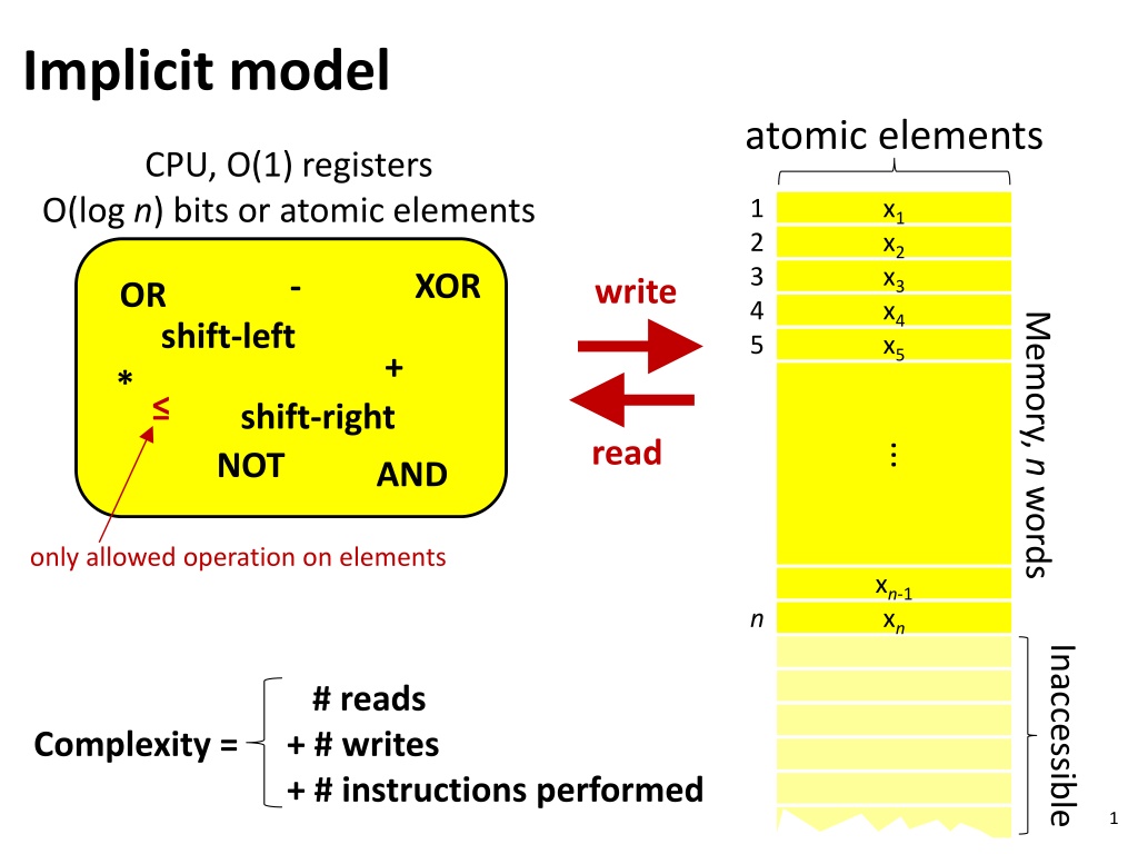 Implicit model atomic elements CPU, O(1) registers O(log n) bits or atomic elements 1 2 3 4 5 x1 x2 x3 x4 x5 - XOR write OR Memory, n words shift-left + * shift-right read ... NOT AND only allowed operation on elements xn-1 xn n Inaccessible # reads + # writes + # instructions performed Complexity = 1
