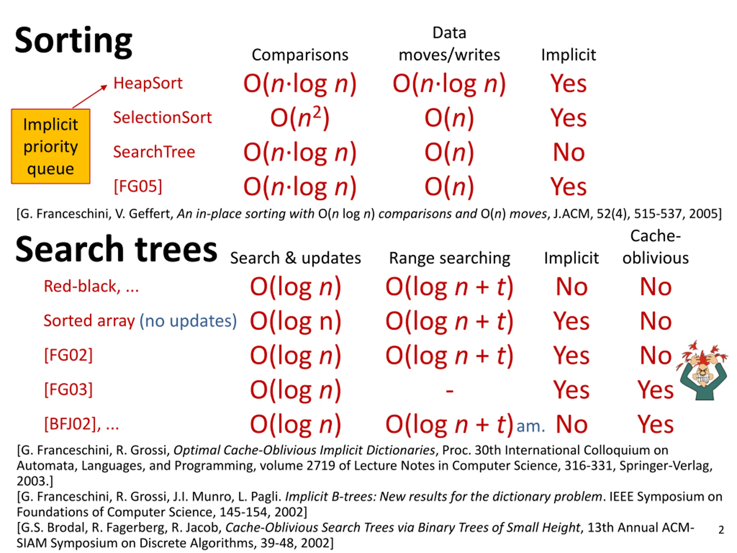 Sorting Data Comparisons O(n log n) O(n2) O(n log n) O(n log n) moves/writes O(n log n) O(n) O(n) O(n) Implicit Yes Yes No Yes HeapSort SelectionSort Implicit priority queue SearchTree [FG05] [G. Franceschini, V. Geffert, An in-place sorting with O(n log n) comparisons and O(n) moves, J.ACM, 52(4), 515-537, 2005] Search trees Cache- oblivious No No No Yes Yes Search & updates O(log n) O(log n) O(log n) O(log n) O(log n) Range searching O(log n + t) O(log n + t) O(log n + t) - O(log n + t) Implicit No Yes Yes Yes No am. Red-black, ... (no updates) Sorted array [FG02] [FG03] [BFJ02], ... [G. Franceschini, R. Grossi, Optimal Cache-Oblivious Implicit Dictionaries, Proc. 30th International Colloquium on Automata, Languages, and Programming, volume 2719 of Lecture Notes in Computer Science, 316-331, Springer-Verlag, 2003.] [G. Franceschini, R. Grossi, J.I. Munro, L. Pagli. Implicit B-trees: New results for the dictionary problem. IEEE Symposium on Foundations of Computer Science, 145-154, 2002] [G.S. Brodal, R. Fagerberg, R. Jacob, Cache-Oblivious Search Trees via Binary Trees of Small Height, 13th Annual ACM- SIAM Symposium on Discrete Algorithms, 39-48, 2002] 2