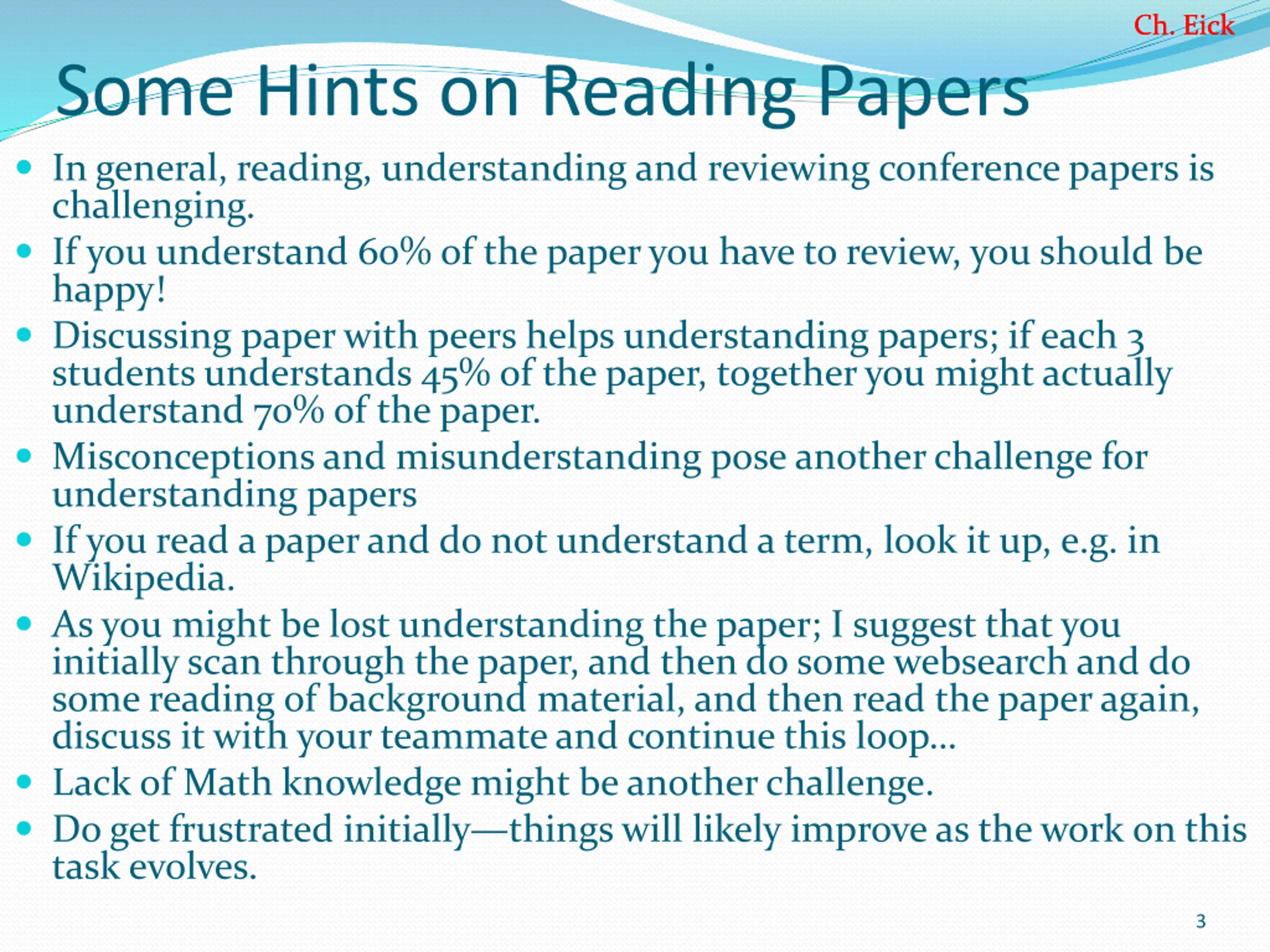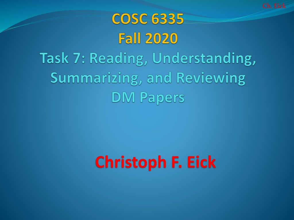 Ch. Eick Ch. Eick Some Hints on Reading Papers In general, reading, understanding and reviewing conference papers is challenging. If you understand 60% of the paper you have to review, you should be happy! Discussing paper with peers helps understanding papers; if each 3 students understands 45% of the paper, together you might actually understand 70% of the paper. Misconceptions and misunderstanding pose another challenge for understanding papers If you read a paper and do not understand a term, look it up, e.g. in Wikipedia. As you might be lost understanding the paper; I suggest that you initially scan through the paper, and then do some websearch and do some reading of background material, and then read the paper again, discuss it with your teammate and continue this loop Lack of Math knowledge might be another challenge. Do get frustrated initially things will likely improve as the work on this task evolves. 3