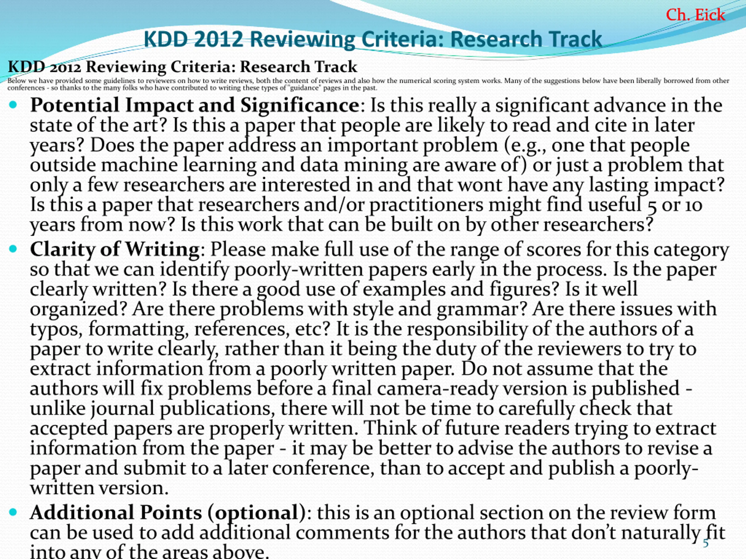 Ch. Eick Ch. Eick KDD 2012 Reviewing Criteria: Research Track KDD 2012 Reviewing Criteria: Research Track Below we have provided some guidelines to reviewers on how to write reviews, both the content of reviews and also how the numerical scoring system works. Many of the suggestions below have been liberally borrowed from other conferences - so thanks to the many folks who have contributed to writing these types of "guidance" pages in the past. Potential Impact and Significance: Is this really a significant advance in the state of the art? Is this a paper that people are likely to read and cite in later years? Does the paper address an important problem (e.g., one that people outside machine learning and data mining are aware of) or just a problem that only a few researchers are interested in and that wont have any lasting impact? Is this a paper that researchers and/or practitioners might find useful 5 or 10 years from now? Is this work that can be built on by other researchers? Clarity of Writing: Please make full use of the range of scores for this category so that we can identify poorly-written papers early in the process. Is the paper clearly written? Is there a good use of examples and figures? Is it well organized? Are there problems with style and grammar? Are there issues with typos, formatting, references, etc? It is the responsibility of the authors of a paper to write clearly, rather than it being the duty of the reviewers to try to extract information from a poorly written paper. Do not assume that the authors will fix problems before a final camera-ready version is published - unlike journal publications, there will not be time to carefully check that accepted papers are properly written. Think of future readers trying to extract information from the paper - it may be better to advise the authors to revise a paper and submit to a later conference, than to accept and publish a poorly- written version. Additional Points (optional): this is an optional section on the review form can be used to add additional comments for the authors that don t naturally fit into any of the areas above. 5