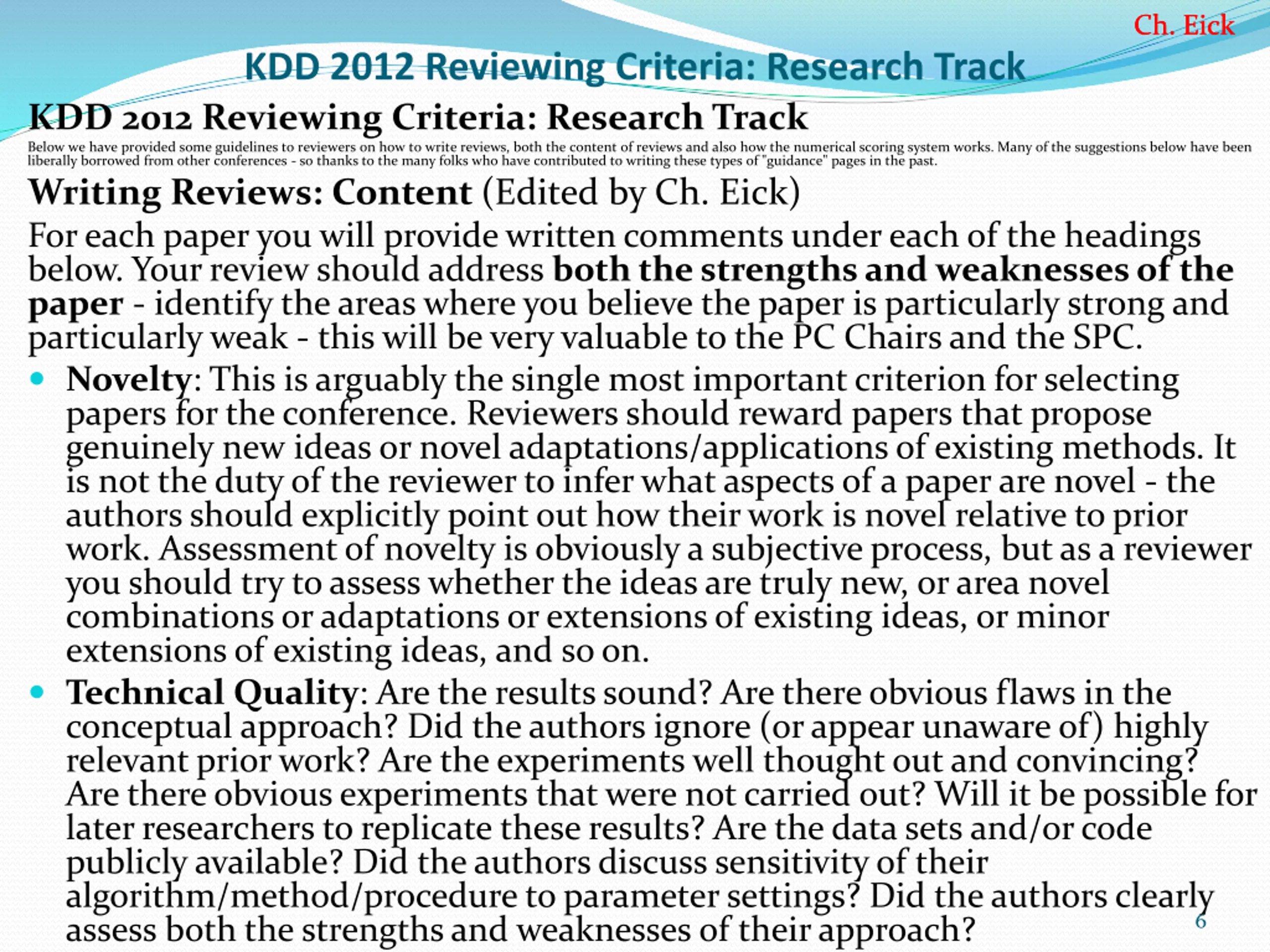 Ch. Eick Ch. Eick KDD 2012 Reviewing Criteria: Research Track KDD 2012 Reviewing Criteria: Research Track Below we have provided some guidelines to reviewers on how to write reviews, both the content of reviews and also how the numerical scoring system works. Many of the suggestions below have been liberally borrowed from other conferences - so thanks to the many folks who have contributed to writing these types of "guidance" pages in the past. Writing Reviews: Content (Edited by Ch. Eick) For each paper you will provide written comments under each of the headings below. Your review should address both the strengths and weaknesses of the paper - identify the areas where you believe the paper is particularly strong and particularly weak - this will be very valuable to the PC Chairs and the SPC. Novelty: This is arguably the single most important criterion for selecting papers for the conference. Reviewers should reward papers that propose genuinely new ideas or novel adaptations/applications of existing methods. It is not the duty of the reviewer to infer what aspects of a paper are novel - the authors should explicitly point out how their work is novel relative to prior work. Assessment of novelty is obviously a subjective process, but as a reviewer you should try to assess whether the ideas are truly new, or area novel combinations or adaptations or extensions of existing ideas, or minor extensions of existing ideas, and so on. Technical Quality: Are the results sound? Are there obvious flaws in the conceptual approach? Did the authors ignore (or appear unaware of) highly relevant prior work? Are the experiments well thought out and convincing? Are there obvious experiments that were not carried out? Will it be possible for later researchers to replicate these results? Are the data sets and/or code publicly available? Did the authors discuss sensitivity of their algorithm/method/procedure to parameter settings? Did the authors clearly assess both the strengths and weaknesses of their approach? 6
