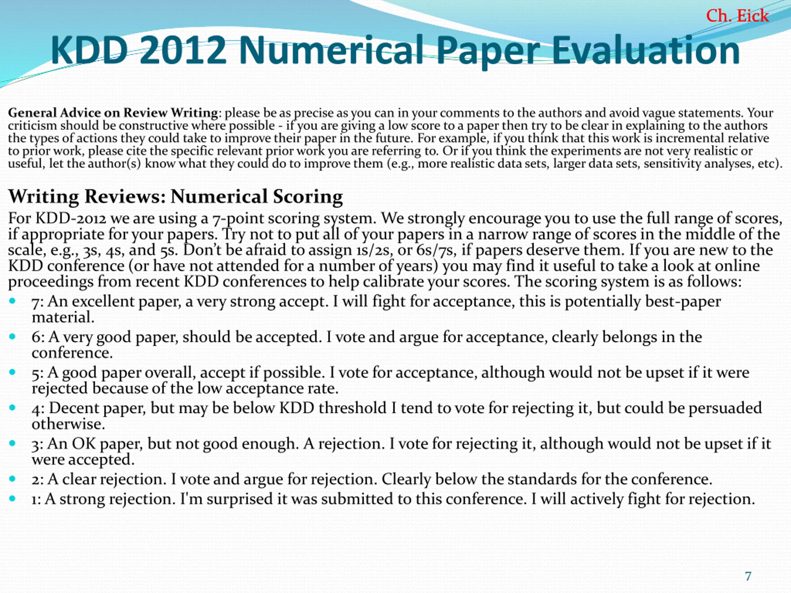 Ch. Eick Ch. Eick KDD 2012 Numerical Paper Evaluation General Advice on Review Writing: please be as precise as you can in your comments to the authors and avoid vague statements. Your criticism should be constructive where possible - if you are giving a low score to a paper then try to be clear in explaining to the authors the types of actions they could take to improve their paper in the future. For example, if you think that this work is incremental relative to prior work, please cite the specific relevant prior work you are referring to. Or if you think the experiments are not very realistic or useful, let the author(s) know what they could do to improve them (e.g., more realistic data sets, larger data sets, sensitivity analyses, etc). Writing Reviews: Numerical Scoring For KDD-2012 we are using a 7-point scoring system. We strongly encourage you to use the full range of scores, if appropriate for your papers. Try not to put all of your papers in a narrow range of scores in the middle of the scale, e.g., 3s, 4s, and 5s. Don t be afraid to assign 1s/2s, or 6s/7s, if papers deserve them. If you are new to the KDD conference (or have not attended for a number of years) you may find it useful to take a look at online proceedings from recent KDD conferences to help calibrate your scores. The scoring system is as follows: 7: An excellent paper, a very strong accept. I will fight for acceptance, this is potentially best-paper material. 6: A very good paper, should be accepted. I vote and argue for acceptance, clearly belongs in the conference. 5: A good paper overall, accept if possible. I vote for acceptance, although would not be upset if it were rejected because of the low acceptance rate. 4: Decent paper, but may be below KDD threshold I tend to vote for rejecting it, but could be persuaded otherwise. 3: An OK paper, but not good enough. A rejection. I vote for rejecting it, although would not be upset if it were accepted. 2: A clear rejection. I vote and argue for rejection. Clearly below the standards for the conference. 1: A strong rejection. I'm surprised it was submitted to this conference. I will actively fight for rejection. 7