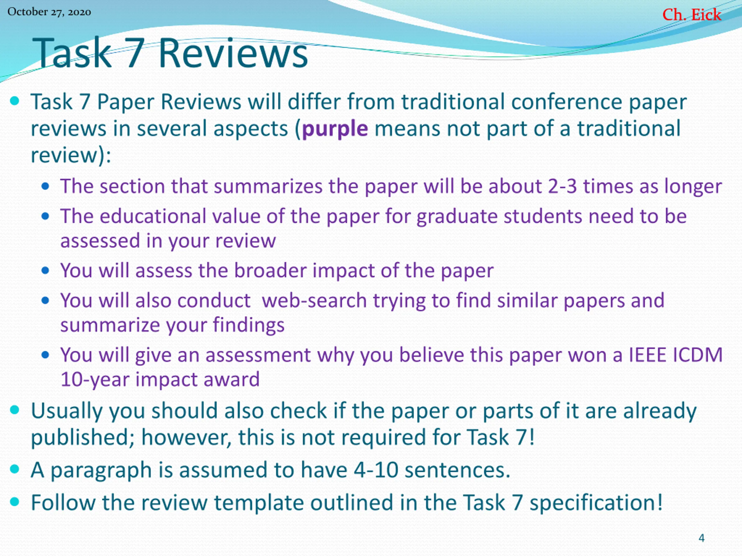 October 27, 2020 Ch. Eick Ch. Eick Task 7 Reviews Task 7 Paper Reviews will differ from traditional conference paper reviews in several aspects (purple means not part of a traditional review): The section that summarizes the paper will be about 2-3 times as longer The educational value of the paper for graduate students need to be assessed in your review You will assess the broader impact of the paper You will also conduct web-search trying to find similar papers and summarize your findings You will give an assessment why you believe this paper won a IEEE ICDM 10-year impact award Usually you should also check if the paper or parts of it are already published; however, this is not required for Task 7! A paragraph is assumed to have 4-10 sentences. Follow the review template outlined in the Task 7 specification! 4