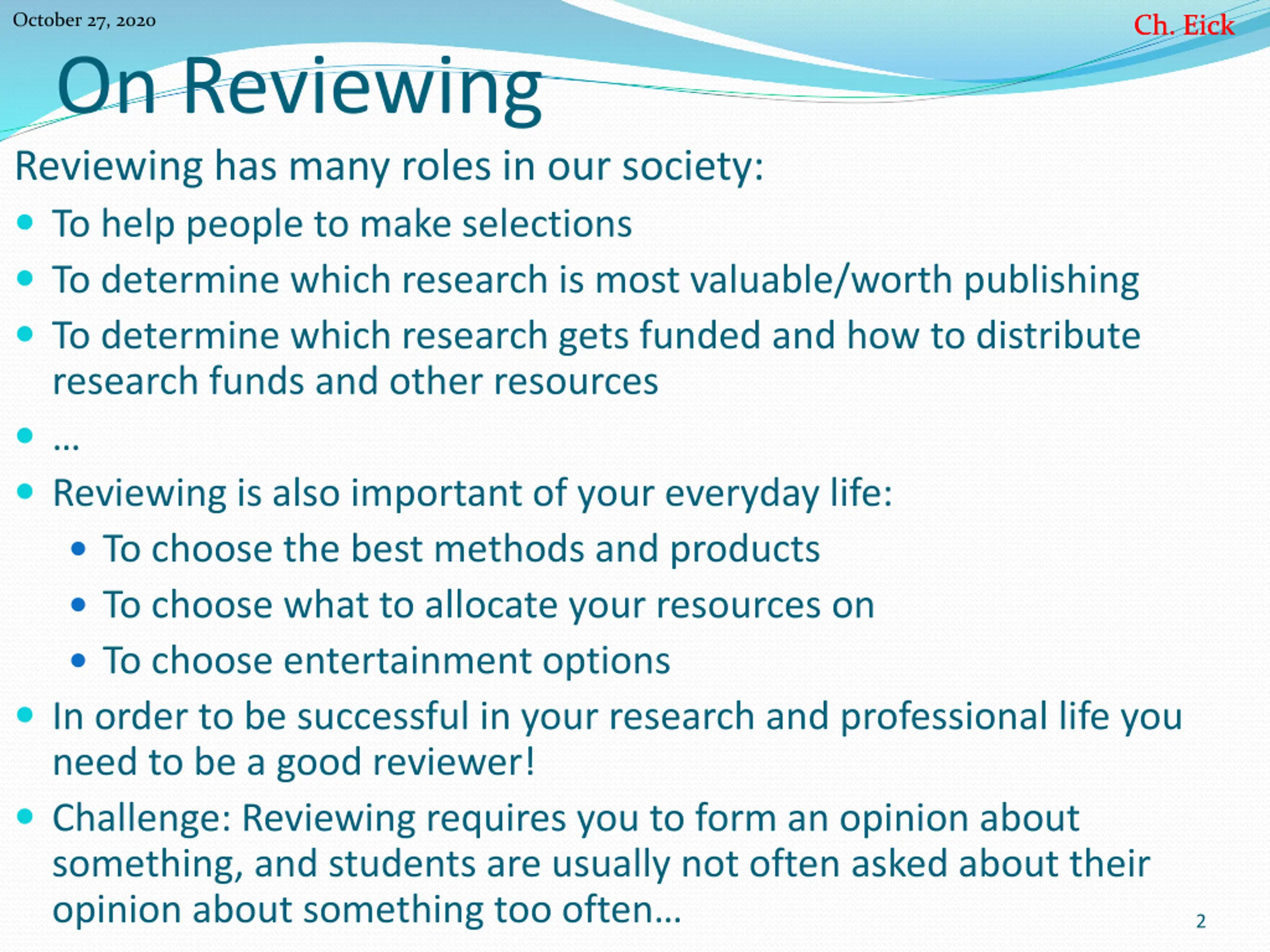 October 27, 2020 Ch. Eick Ch. Eick On Reviewing Reviewing has many roles in our society: To help people to make selections To determine which research is most valuable/worth publishing To determine which research gets funded and how to distribute research funds and other resources Reviewing is also important of your everyday life: To choose the best methods and products To choose what to allocate your resources on To choose entertainment options In order to be successful in your research and professional life you need to be a good reviewer! Challenge: Reviewing requires you to form an opinion about something, and students are usually not often asked about their opinion about something too often 2