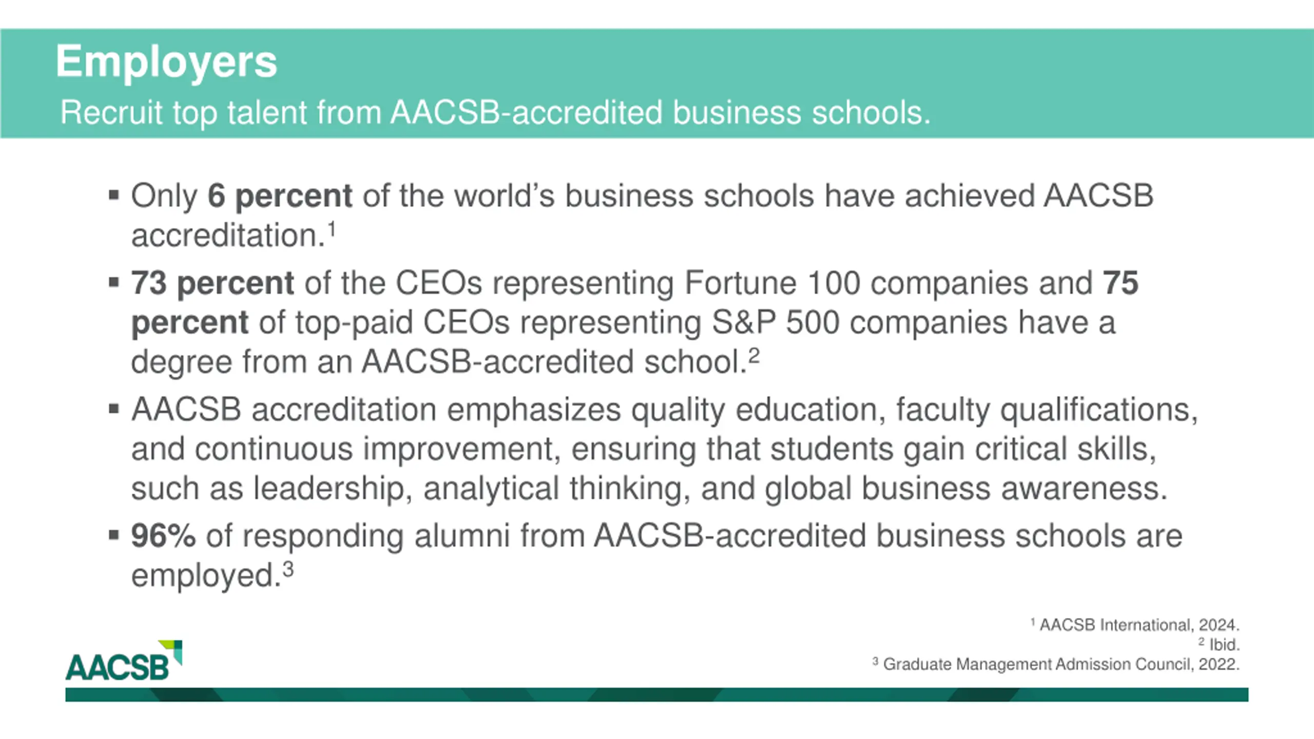 Employers Recruit top talent from AACSB-accredited business schools. Only 6 percentof the world s business schools have achieved AACSB accreditation.1 73 percent of the CEOs representing Fortune 100 companies and 75 percent of top-paid CEOs representing S&P 500 companies have a degree from an AACSB-accredited school.2 AACSB accreditation emphasizes quality education, faculty qualifications, and continuous improvement, ensuring that students gain critical skills, such as leadership, analytical thinking, and global business awareness. 96% of responding alumni from AACSB-accredited business schools are employed.3 1 AACSB International, 2024. 2 Ibid. 3 Graduate Management Admission Council, 2022.