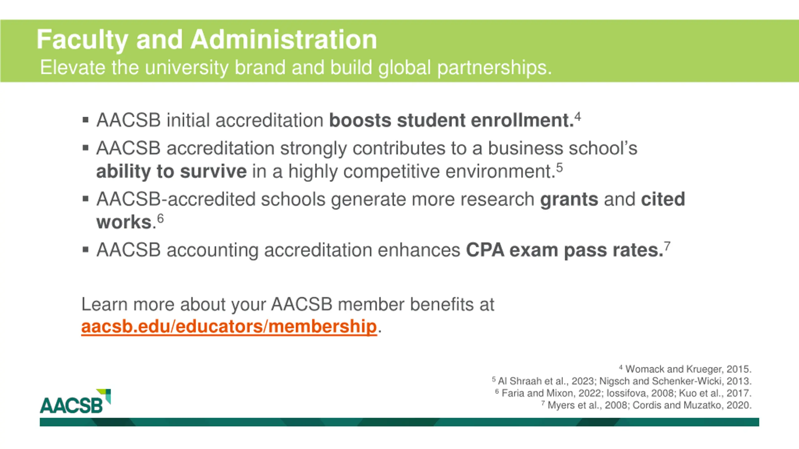 Faculty and Administration Elevate the university brand and build global partnerships. AACSB initial accreditation boosts student enrollment.4 AACSB accreditation strongly contributes to a business school s ability to survive in a highly competitive environment.5 AACSB-accredited schools generate more research grants and cited works.6 AACSB accounting accreditation enhances CPA exam pass rates.7 Learn more about your AACSB member benefits at aacsb.edu/educators/membership. 4 Womack and Krueger, 2015. 5 Al Shraah et al., 2023; Nigsch and Schenker-Wicki, 2013. 6 Faria and Mixon, 2022; Iossifova, 2008; Kuo et al., 2017. 7 Myers et al., 2008; Cordis and Muzatko, 2020.