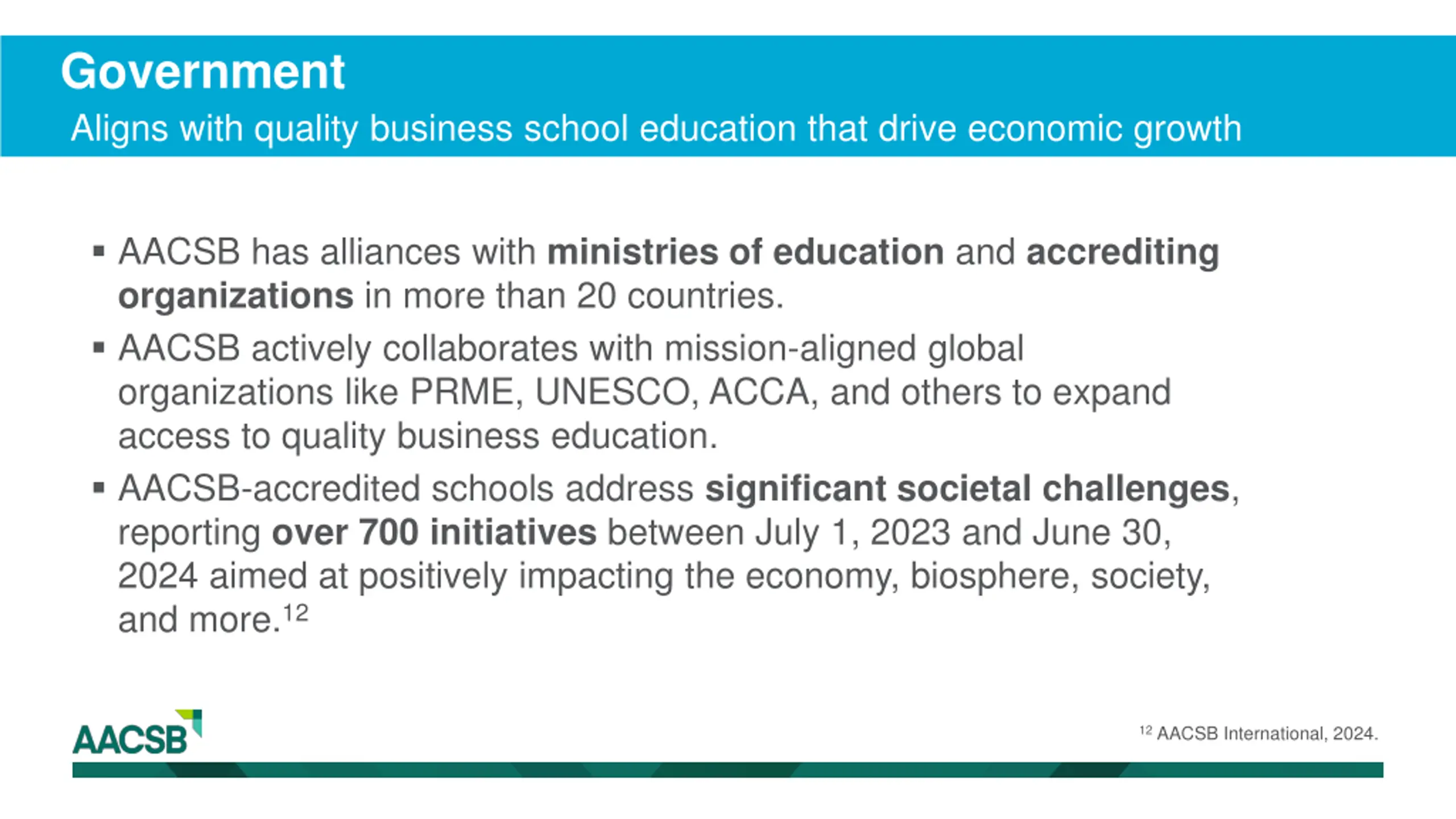 Government Aligns with quality business school education that drive economic growth AACSB has alliances with ministries of education and accrediting organizations in more than 20 countries. AACSB actively collaborates with mission-aligned global organizations like PRME, UNESCO, ACCA, and others to expand access to quality business education. AACSB-accredited schools address significant societal challenges, reporting over 700 initiatives between July 1, 2023 and June 30, 2024 aimed at positively impacting the economy, biosphere, society, and more.12 12 AACSB International, 2024.