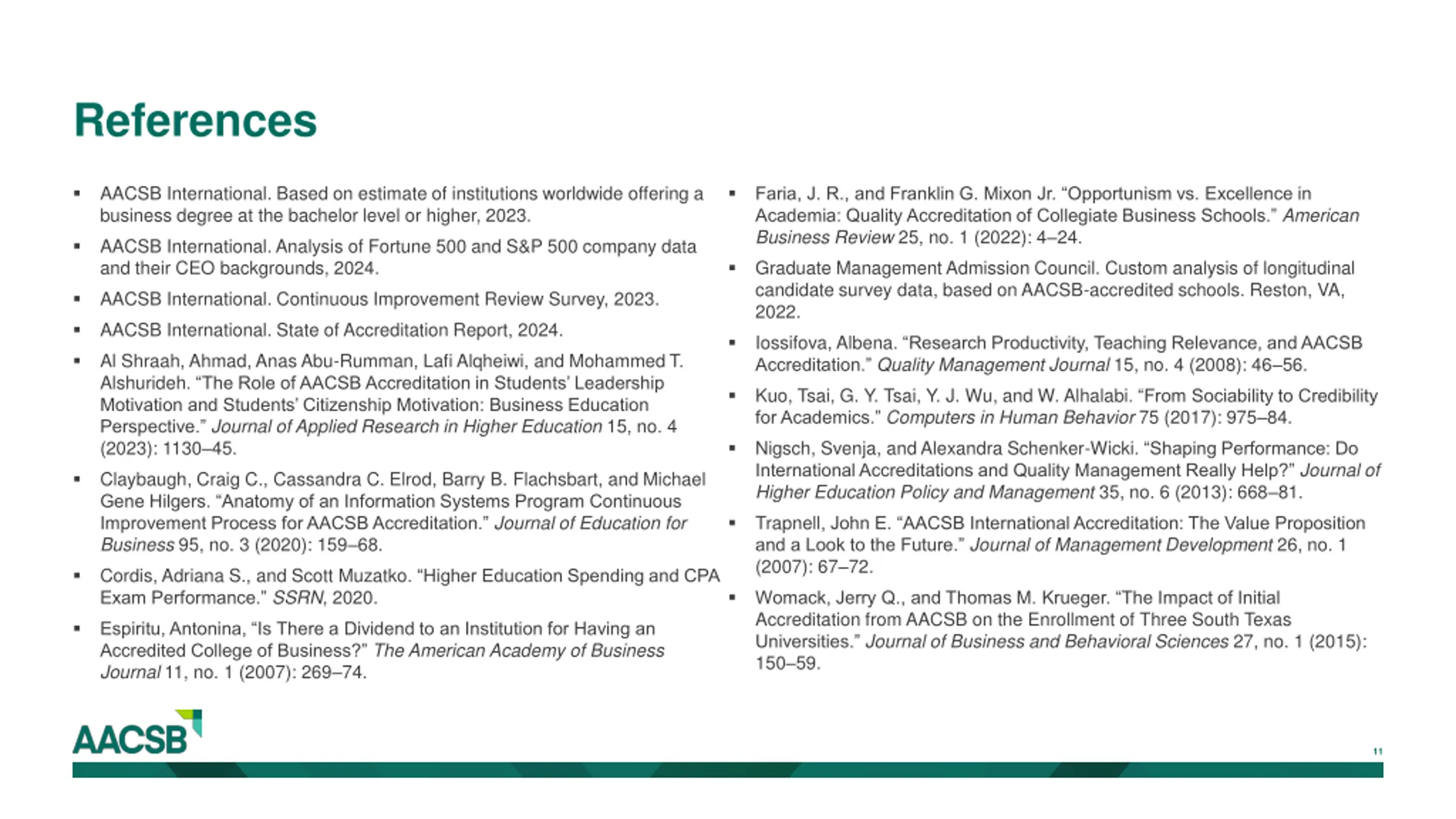 References AACSB International. Based on estimate of institutions worldwide offering a business degree at the bachelor level or higher, 2023. Faria, J. R., and Franklin G. Mixon Jr. Opportunism vs. Excellence in Academia: Quality Accreditation of Collegiate Business Schools. American Business Review 25, no. 1 (2022): 4 24. AACSB International. Analysis of Fortune 500 and S&P 500 company data and their CEO backgrounds, 2024. Graduate Management Admission Council. Custom analysis of longitudinal candidate survey data, based on AACSB-accredited schools. Reston, VA, 2022. AACSB International. Continuous Improvement Review Survey, 2023. AACSB International. State of Accreditation Report, 2024. Iossifova, Albena. Research Productivity, Teaching Relevance, and AACSB Accreditation. Quality Management Journal 15, no. 4 (2008): 46 56. Al Shraah, Ahmad, Anas Abu-Rumman, Lafi Alqheiwi, and Mohammed T. Alshurideh. The Role of AACSB Accreditation in Students Leadership Motivation and Students Citizenship Motivation: Business Education Perspective. Journal of Applied Research in Higher Education 15, no. 4 (2023): 1130 45. Kuo, Tsai, G. Y. Tsai, Y. J. Wu, and W. Alhalabi. From Sociability to Credibility for Academics. Computers in Human Behavior 75 (2017): 975 84. Nigsch, Svenja, and Alexandra Schenker-Wicki. Shaping Performance: Do International Accreditations and Quality Management Really Help? Journal of Higher Education Policy and Management 35, no. 6 (2013): 668 81. Claybaugh, Craig C., Cassandra C. Elrod, Barry B. Flachsbart, and Michael Gene Hilgers. Anatomy of an Information Systems Program Continuous Improvement Process for AACSB Accreditation. Journal of Education for Business 95, no. 3 (2020): 159 68. Trapnell, John E. AACSB International Accreditation: The Value Proposition and a Look to the Future. Journal of Management Development 26, no. 1 (2007): 67 72. Cordis, Adriana S., and Scott Muzatko. Higher Education Spending and CPA Exam Performance. SSRN, 2020. Womack, Jerry Q., and Thomas M. Krueger. The Impact of Initial Accreditation from AACSB on the Enrollment of Three South Texas Universities. Journal of Business and Behavioral Sciences 27, no. 1 (2015): 150 59. Espiritu, Antonina, Is There a Dividend to an Institution for Having an Accredited College of Business? The American Academy of Business Journal 11, no. 1 (2007): 269 74. 11
