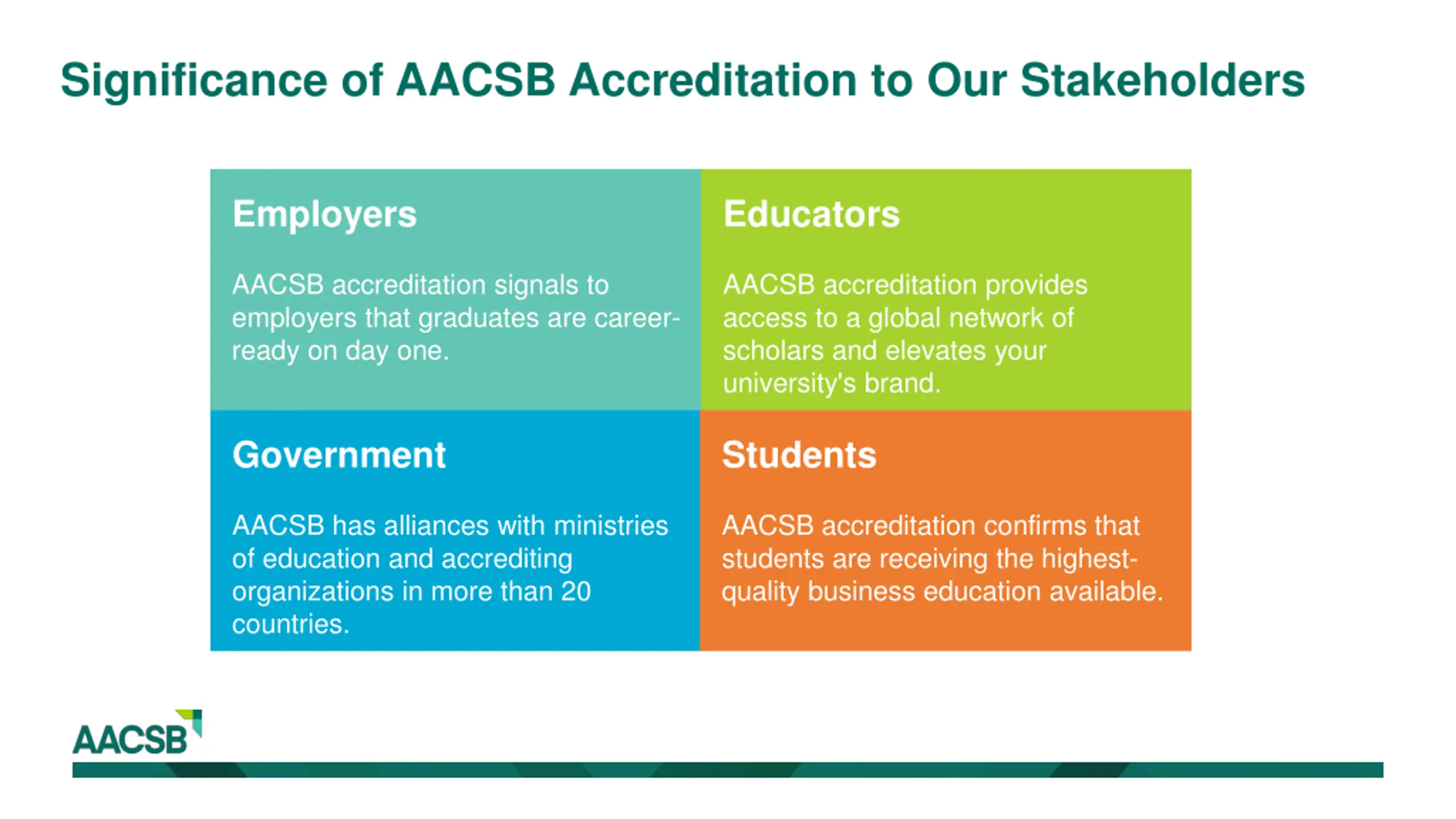 Significance of AACSB Accreditation to Our Stakeholders Employers Educators AACSB accreditation signals to employers that graduates are career- ready on day one. AACSB accreditation provides access to a global network of scholars and elevates your university's brand. Government Students AACSB has alliances with ministries of education and accrediting organizations in more than 20 countries. AACSB accreditation confirms that students are receiving the highest- quality business education available.