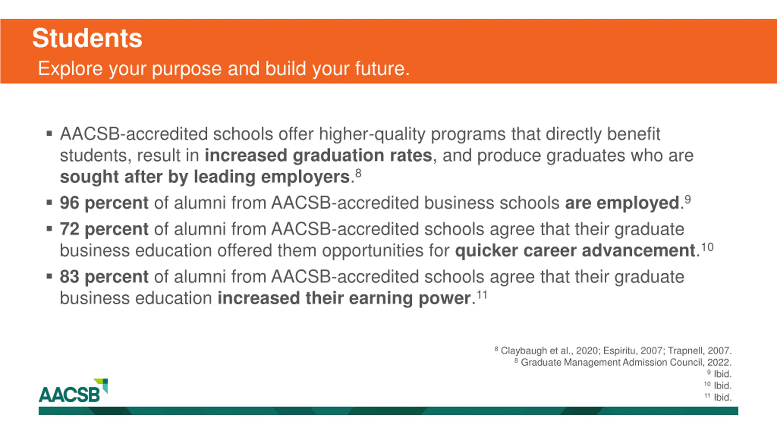 Students Explore your purpose and build your future. AACSB-accredited schools offer higher-quality programs that directly benefit students, result in increased graduation rates, and produce graduates who are sought after by leading employers.8 96 percent of alumni from AACSB-accredited business schools are employed.9 72 percent of alumni from AACSB-accredited schools agree that their graduate business education offered them opportunities for quicker career advancement.10 83 percent of alumni from AACSB-accredited schools agree that their graduate business education increased their earning power.11 8 Claybaugh et al., 2020; Espiritu, 2007; Trapnell, 2007. 8 Graduate Management Admission Council, 2022. 9 Ibid. 10 Ibid. 11 Ibid.