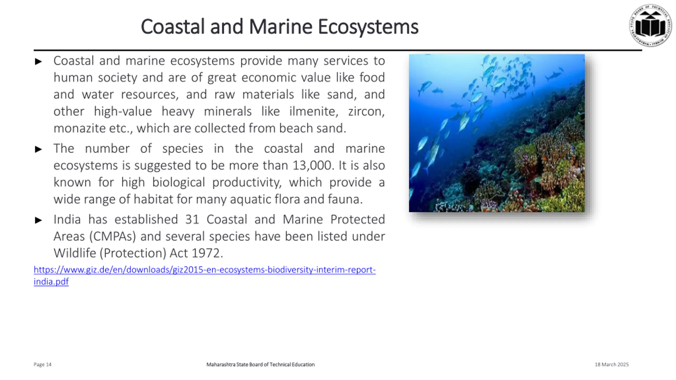 Coastal Coastal and and Marine Ecosystems Marine Ecosystems Coastal and marine ecosystems provide many services to human society and are of great economic value like food and water resources, and raw materials like sand, and other high-value heavy minerals like ilmenite, zircon, monazite etc., which are collected from beach sand. The number of species in the coastal and marine ecosystems is suggested to be more than 13,000. It is also known for high biological productivity, which provide a wide range of habitat for many aquatic flora and fauna. India has established 31 Coastal and Marine Protected Areas (CMPAs) and several species have been listed under Wildlife (Protection) Act 1972. https://www.giz.de/en/downloads/giz2015-en-ecosystems-biodiversity-interim-report- india.pdf Page 14 Maharashtra State Board of Technical Education Maharashtra State Board of Technical Education 18 March 2025