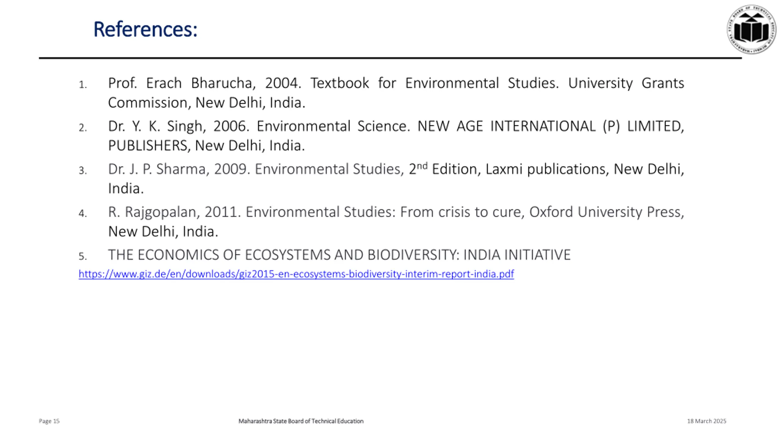 References: References: Prof. Erach Bharucha, 2004. Textbook for Environmental Studies. University Grants Commission, New Delhi, India. Dr. Y. K. Singh, 2006. Environmental Science. NEW AGE INTERNATIONAL (P) LIMITED, PUBLISHERS, New Delhi, India. Dr. J. P. Sharma, 2009. Environmental Studies, 2nd Edition, Laxmi publications, New Delhi, India. R. Rajgopalan, 2011. Environmental Studies: From crisis to cure, Oxford University Press, New Delhi, India. THE ECONOMICS OF ECOSYSTEMS AND BIODIVERSITY: INDIA INITIATIVE https://www.giz.de/en/downloads/giz2015-en-ecosystems-biodiversity-interim-report-india.pdf 1. 2. 3. 4. 5. Page 15 Maharashtra State Board of Technical Education Maharashtra State Board of Technical Education 18 March 2025