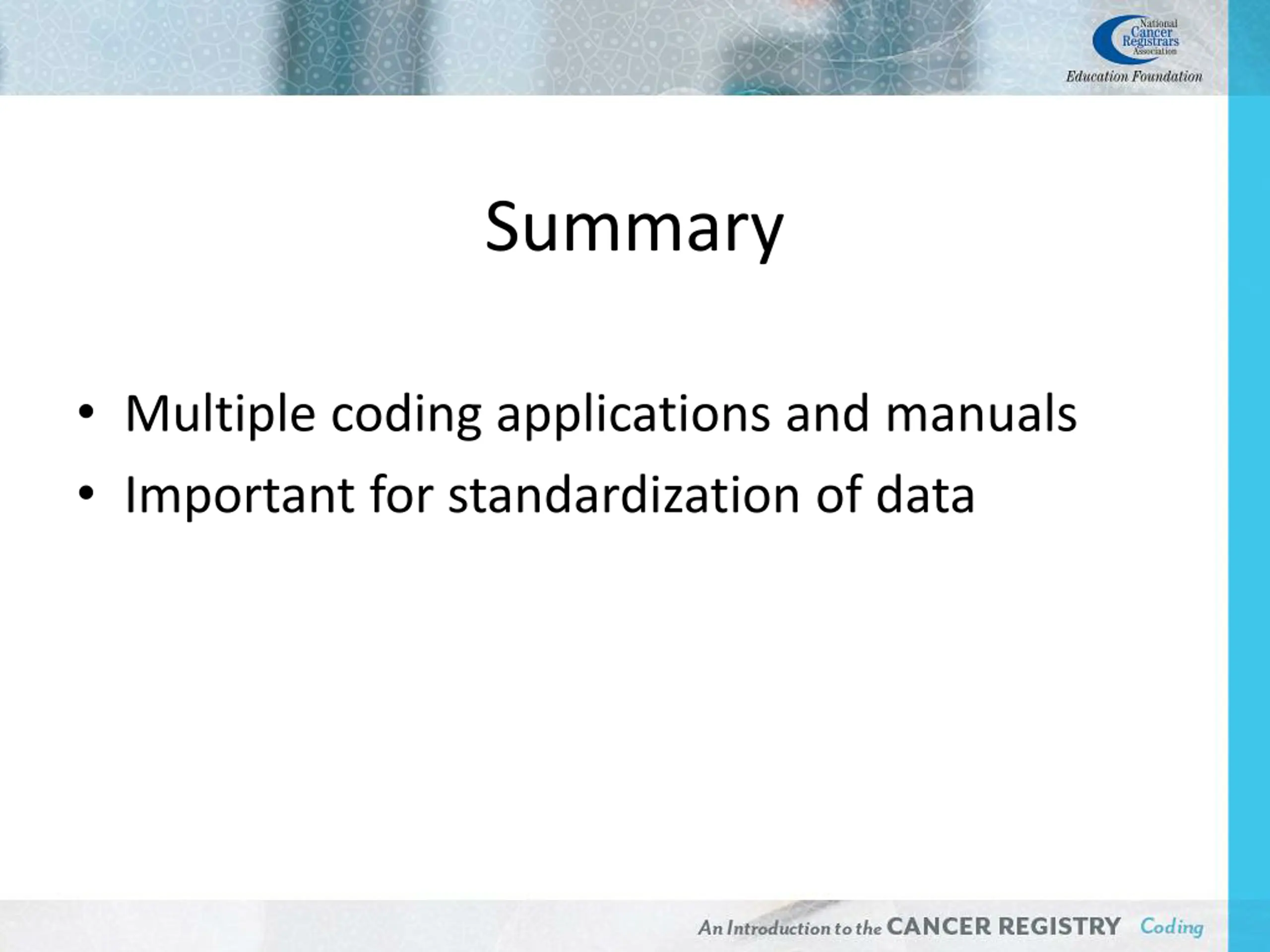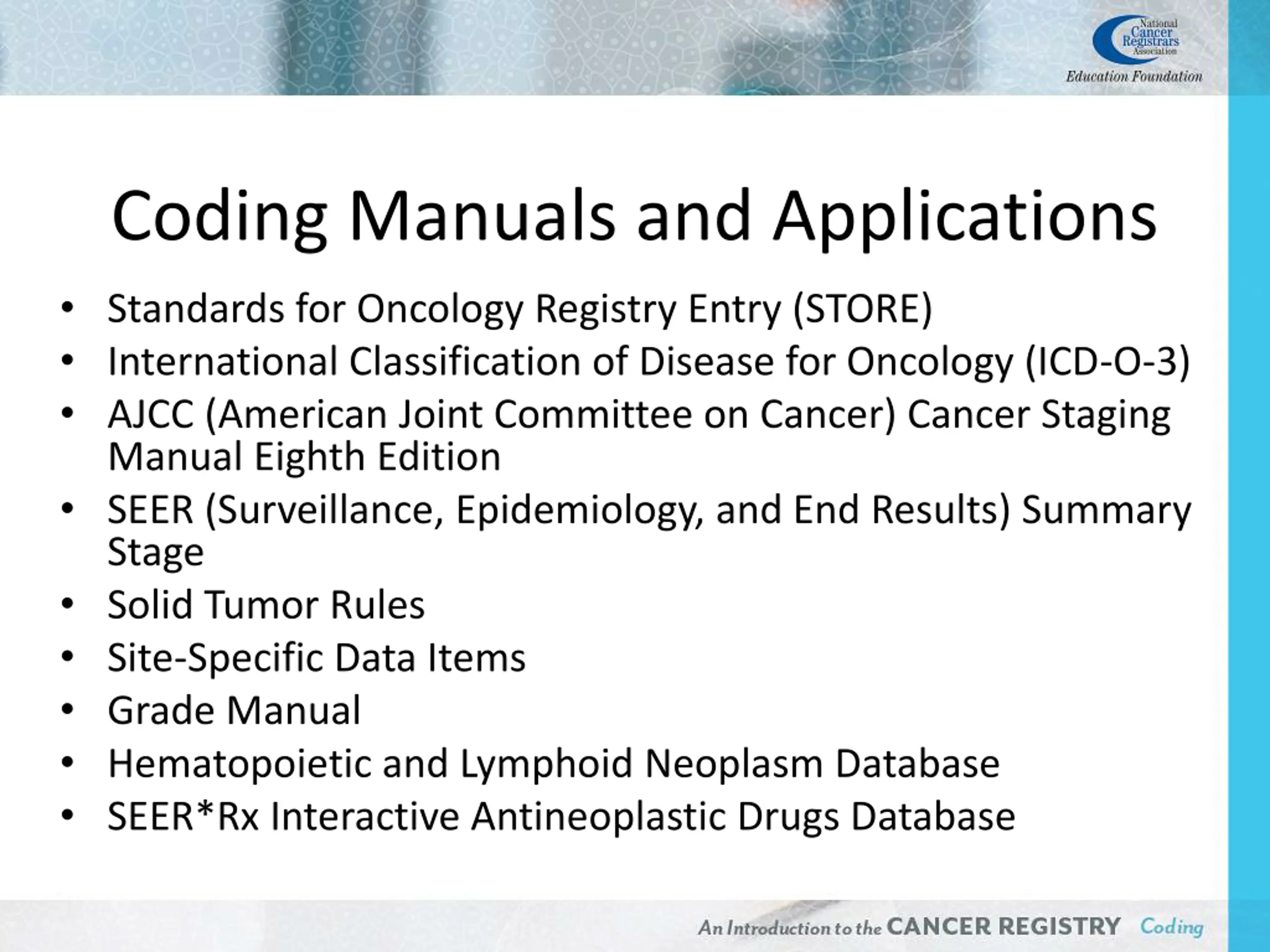 Coding Manuals and Applications Standards for Oncology Registry Entry (STORE) International Classification of Disease for Oncology (ICD-O-3) AJCC (American Joint Committee on Cancer) Cancer Staging Manual Eighth Edition SEER (Surveillance, Epidemiology, and End Results) Summary Stage Solid Tumor Rules Site-Specific Data Items Grade Manual Hematopoietic and Lymphoid Neoplasm Database SEER*Rx Interactive Antineoplastic Drugs Database