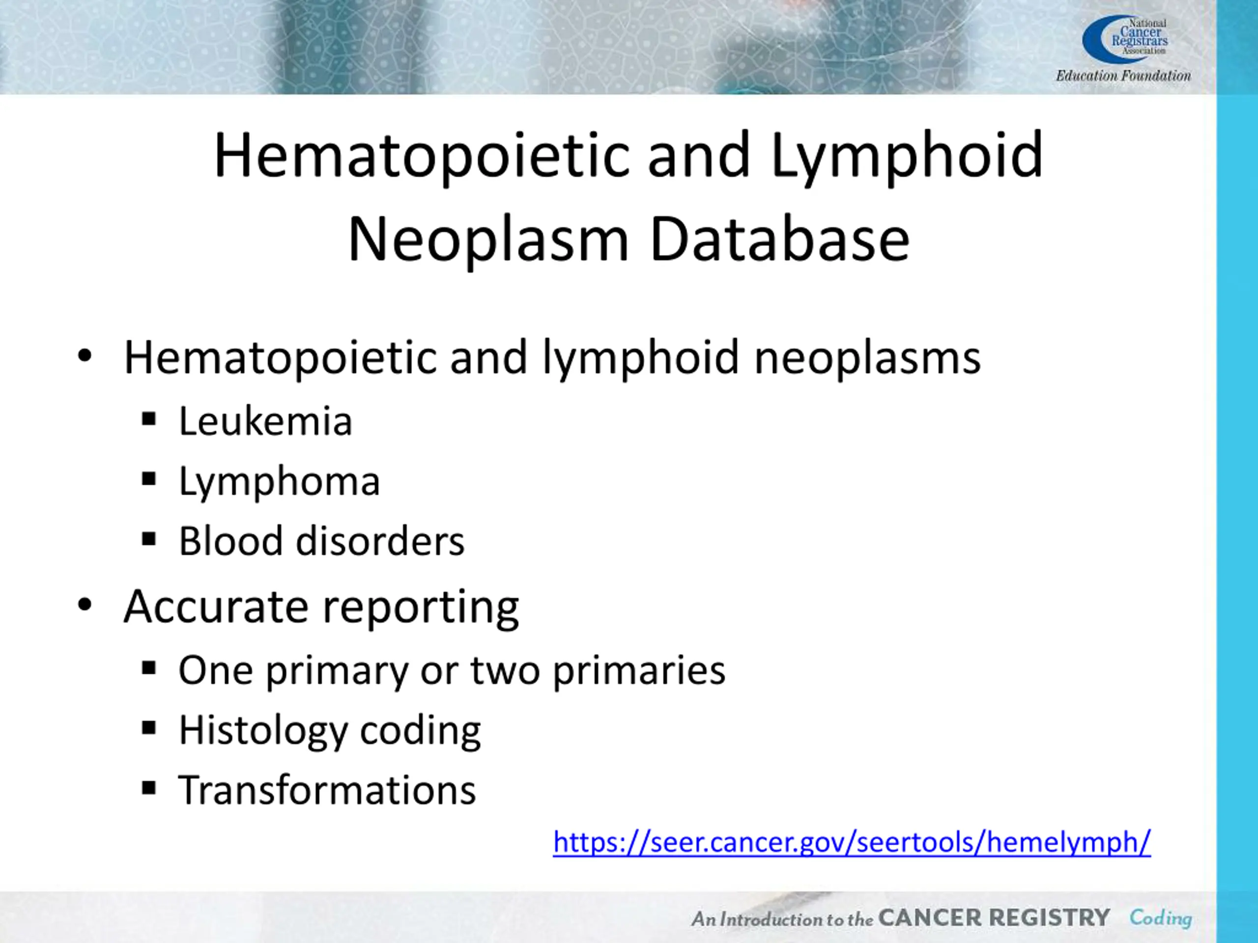 Hematopoietic and Lymphoid Neoplasm Database Hematopoietic and lymphoid neoplasms Leukemia Lymphoma Blood disorders Accurate reporting One primary or two primaries Histology coding Transformations https://seer.cancer.gov/seertools/hemelymph/