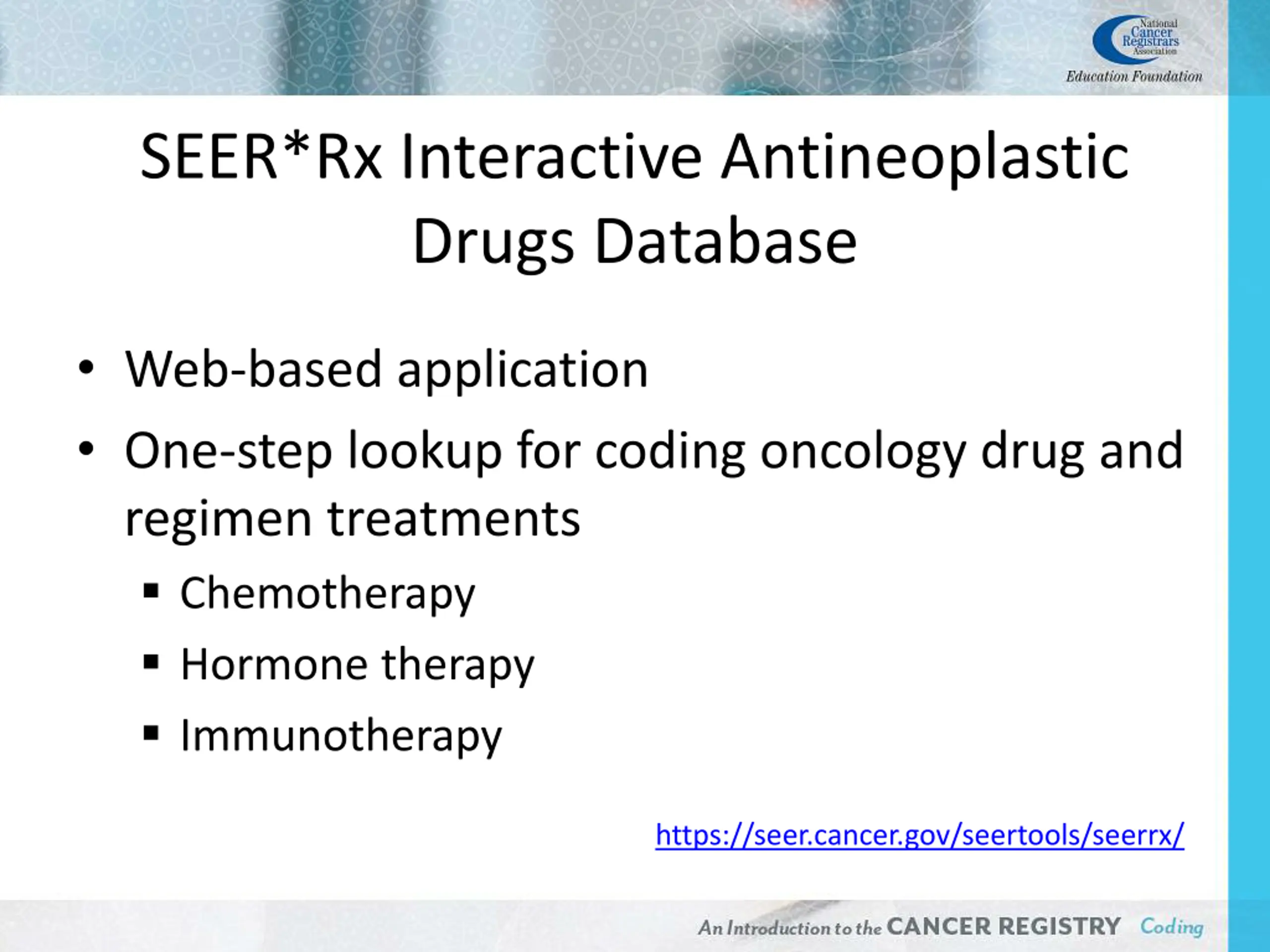 SEER*Rx Interactive Antineoplastic Drugs Database Web-based application One-step lookup for coding oncology drug and regimen treatments Chemotherapy Hormone therapy Immunotherapy https://seer.cancer.gov/seertools/seerrx/