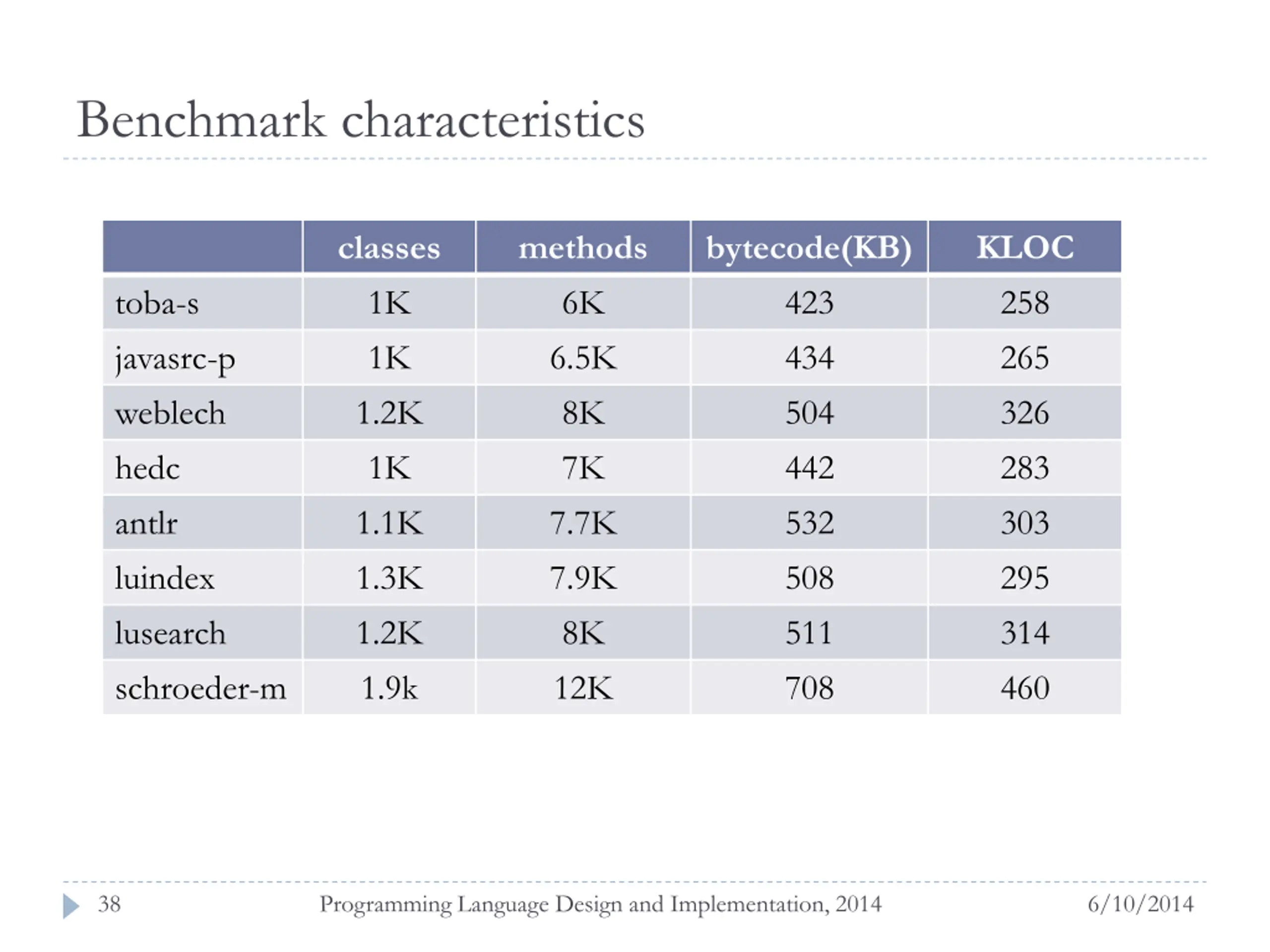 Benchmark characteristics classes 1K 1K 1.2K 1K 1.1K 1.3K 1.2K 1.9k methods 6K 6.5K 8K 7K 7.7K 7.9K 8K 12K bytecode(KB) 423 434 504 442 532 508 511 708 KLOC 258 265 326 283 303 295 314 460 toba-s javasrc-p weblech hedc antlr luindex lusearch schroeder-m 38 Programming Language Design and Implementation, 2014 6/10/2014