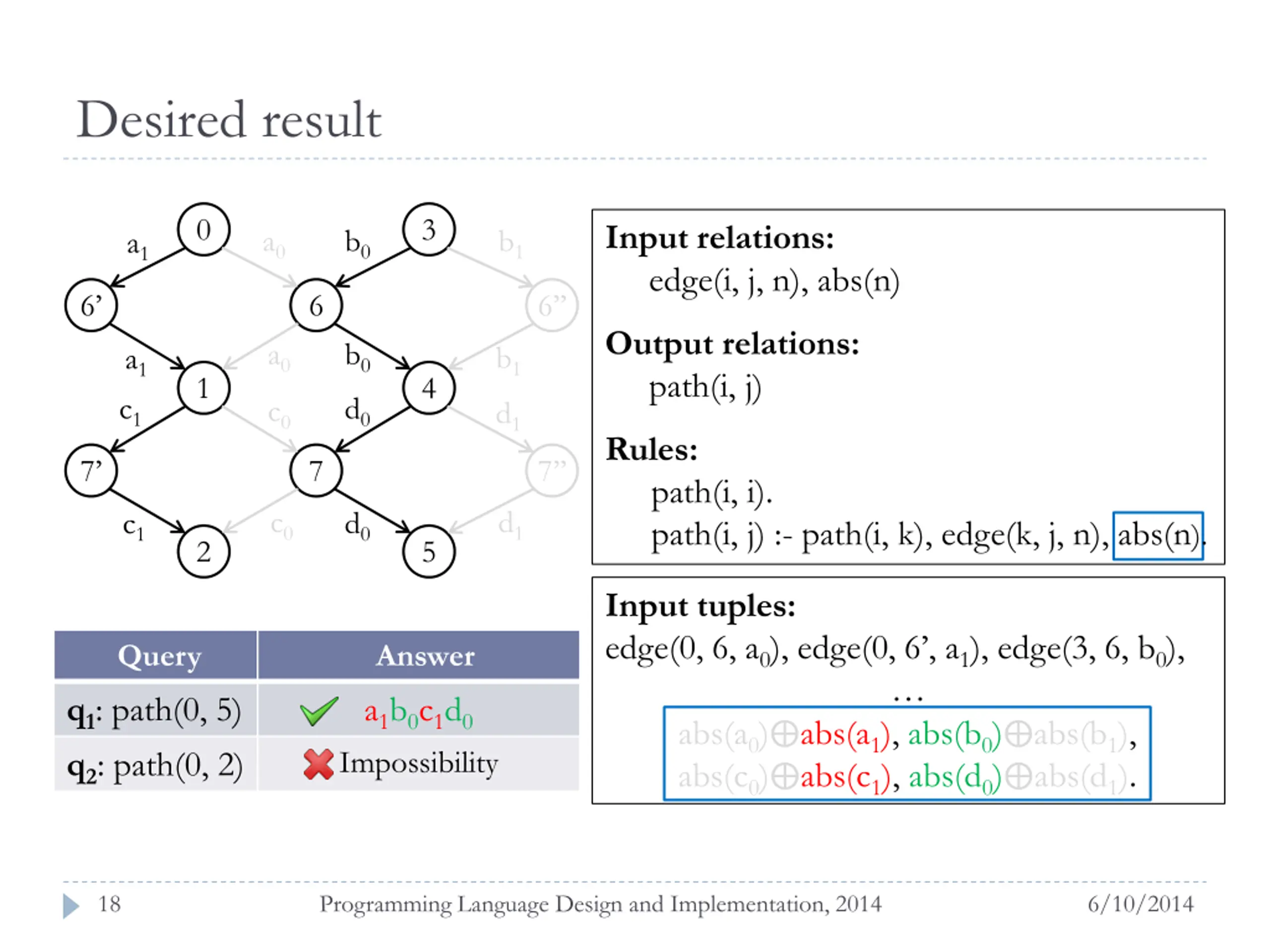 Desired result 0 3 Input relations: edge(i, j, n), abs(n) a0 b0 b1 a1 6 6 6 Output relations: path(i, j) a0 b0 b1 a1 1 4 c1 d0 c0 d1 Rules: (1) path(i, i). (2) path(i, j) :- path(i, k), edge(k, j, n), abs(n). 7 7 7 c0 d1 d0 c1 2 5 Input tuples: edge(0, 6, a0), edge(0, 6 , a1), edge(3, 6, b0), abs(a0) abs(a1), abs(b0) abs(b1), abs(c0) abs(c1), abs(d0) abs(d1). Query Answer a1b0c1d0 Impossibility q1: path(0, 5) q2: path(0, 2) 18 Programming Language Design and Implementation, 2014 6/10/2014