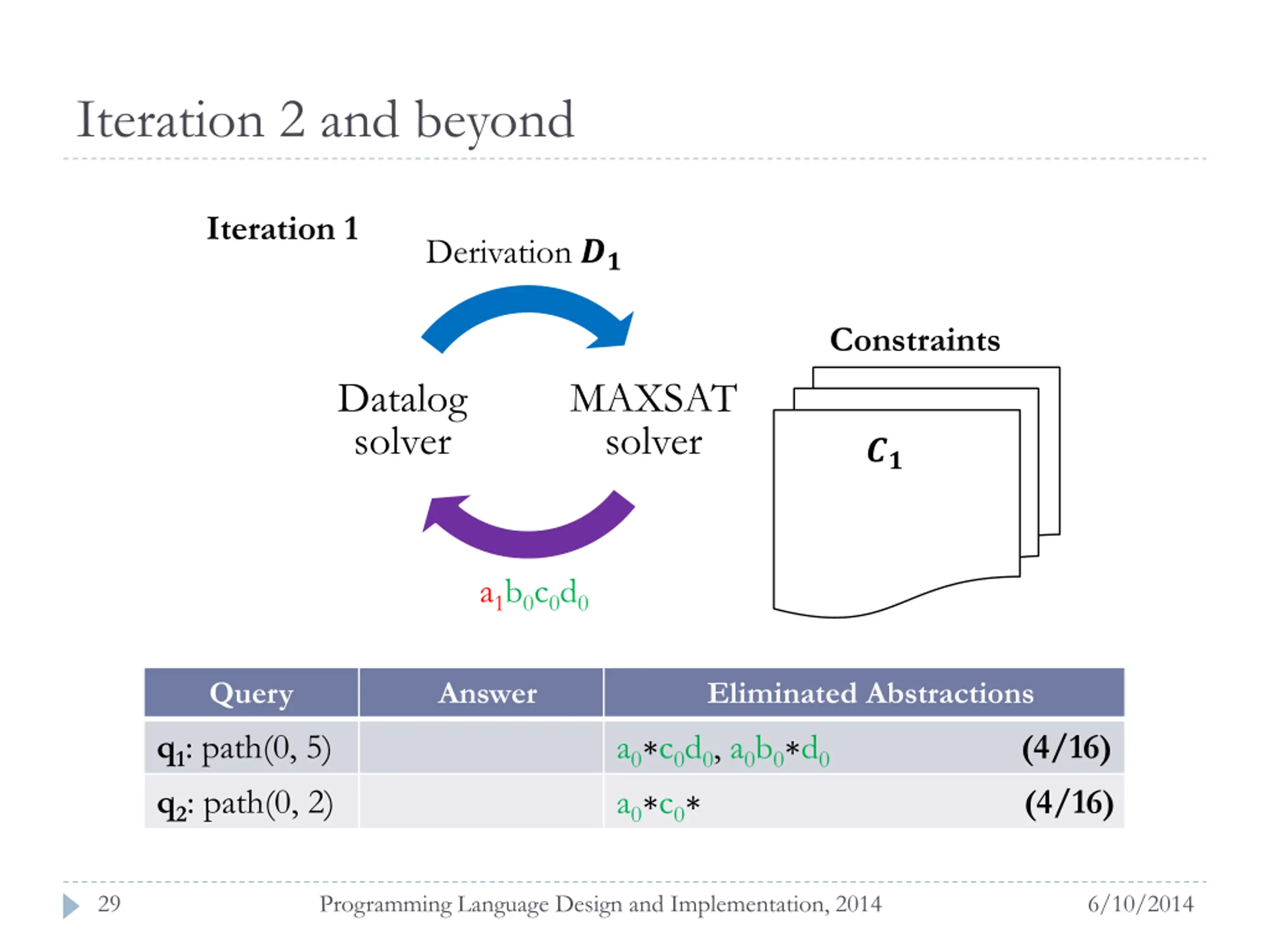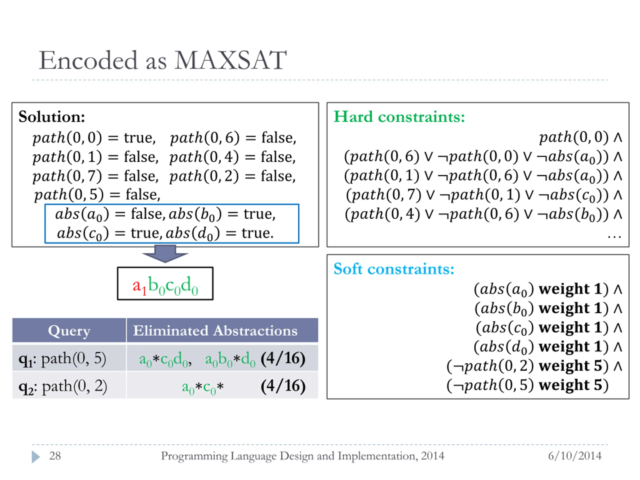Encoded as MAXSAT Solution: ??? 0,0 = true,??? 0,6 = false, ??? 0,1 = false,??? 0,4 = false, ??? 0,7 = false,??? 0,2 = false, ??? 0,5 = false,?,?? 0,6 = 0, ??? ?0 = false,??? ?0 = true, ??? ?0 = true,??? ?0 = true. Hard constraints: ??? (0,0) (??? (0,6) ??? (0,0) ???(?0)) (??? (0,1) ??? (0,6) ???(?0)) (??? (0,7) ??? (0,1) ???(?0)) (??? (0,4) ??? (0,6) ???(?0)) Soft constraints: a1b0c0d0 (??? ?0 ?????? ?) (??? ?0 ?????? ?) (??? ?0 ?????? ?) (??? ?0 ?????? ?) ( ??? 0,2 ?????? ?) ( ??? 0,5 ?????? ?) Query Eliminated Abstractions a0 c0d0, a0b0 d0(4/16) a0 c0 (4/16) q1: path(0, 5) q2: path(0, 2) 28 Programming Language Design and Implementation, 2014 6/10/2014