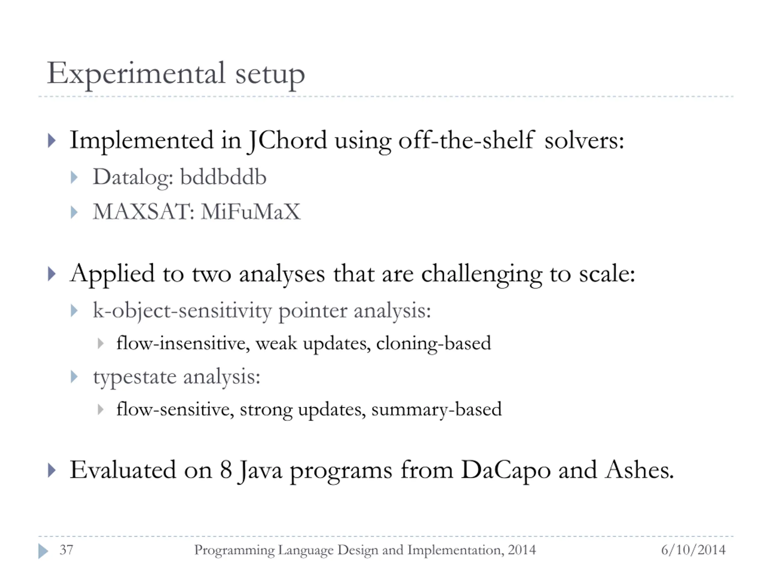 Experimental setup Implemented in JChord using off-the-shelf solvers: Datalog: bddbddb MAXSAT: MiFuMaX Applied to two analyses that are challenging to scale: k-object-sensitivity pointer analysis: flow-insensitive, weak updates, cloning-based typestate analysis: flow-sensitive, strong updates, summary-based Evaluated on 8 Java programs from DaCapo and Ashes. 37 Programming Language Design and Implementation, 2014 6/10/2014