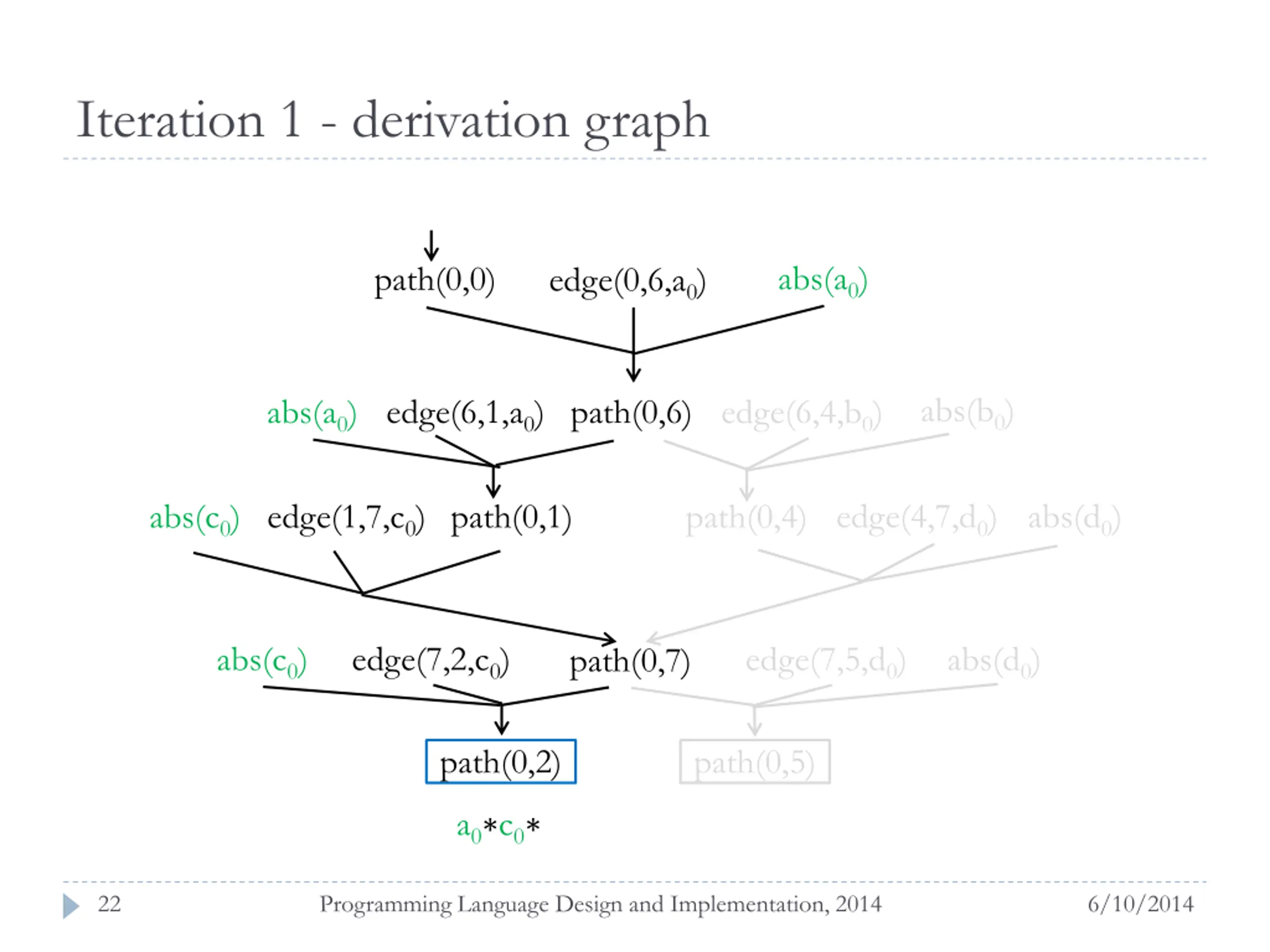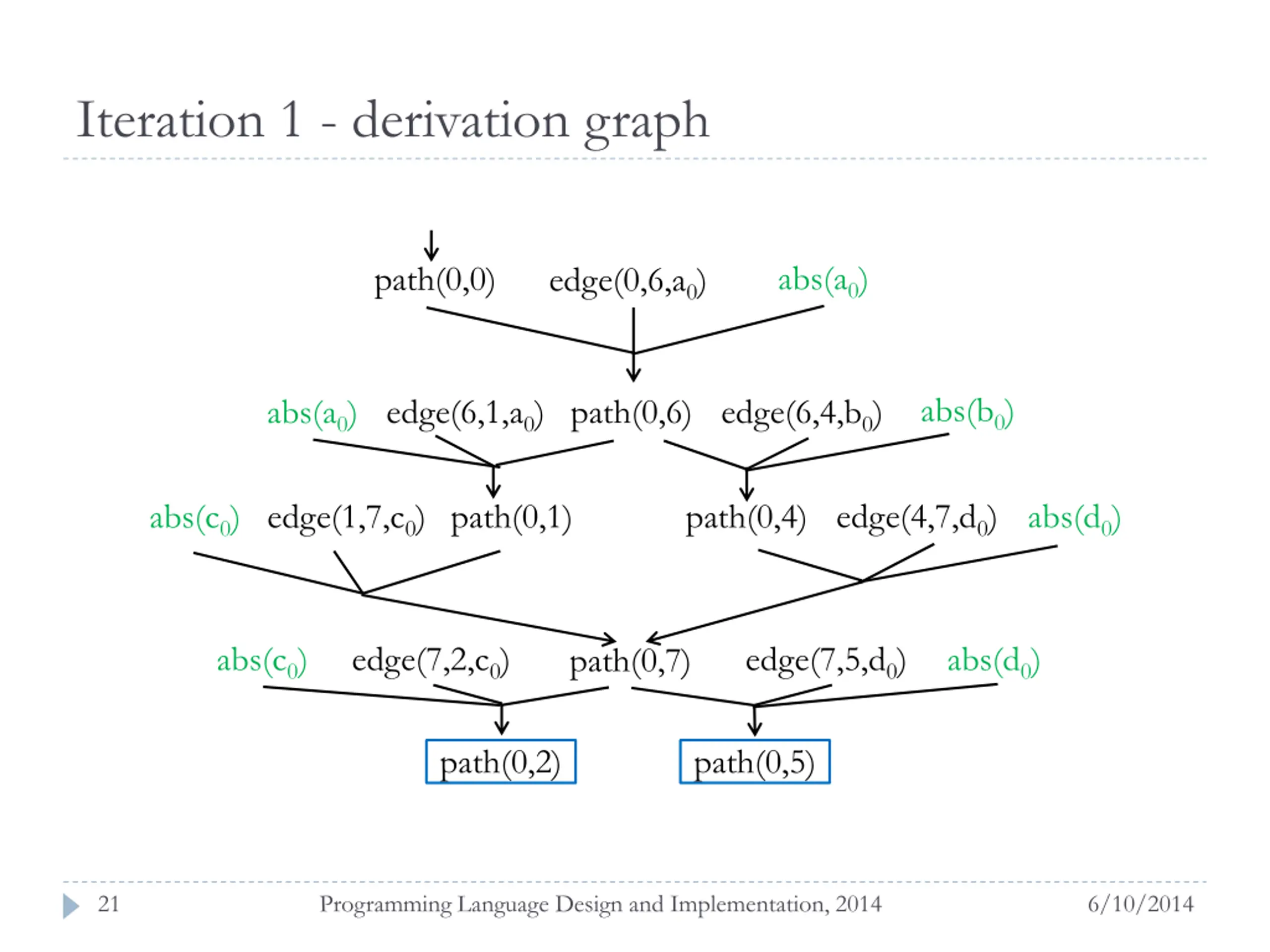 Iteration 1 - derivation graph abs(a0) path(0,0) edge(0,6,a0) abs(b0) abs(a0) edge(6,1,a0) path(0,6) edge(6,4,b0) abs(d0) edge(4,7,d0) abs(c0) edge(1,7,c0) path(0,1) path(0,4) abs(c0) edge(7,2,c0) edge(7,5,d0) abs(d0) path(0,7) path(0,2) path(0,5) 21 Programming Language Design and Implementation, 2014 6/10/2014